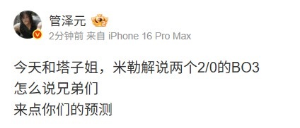 管泽元更新动态:和塔子姐米勒解说两个2/0的BO3 来点你们的预测
