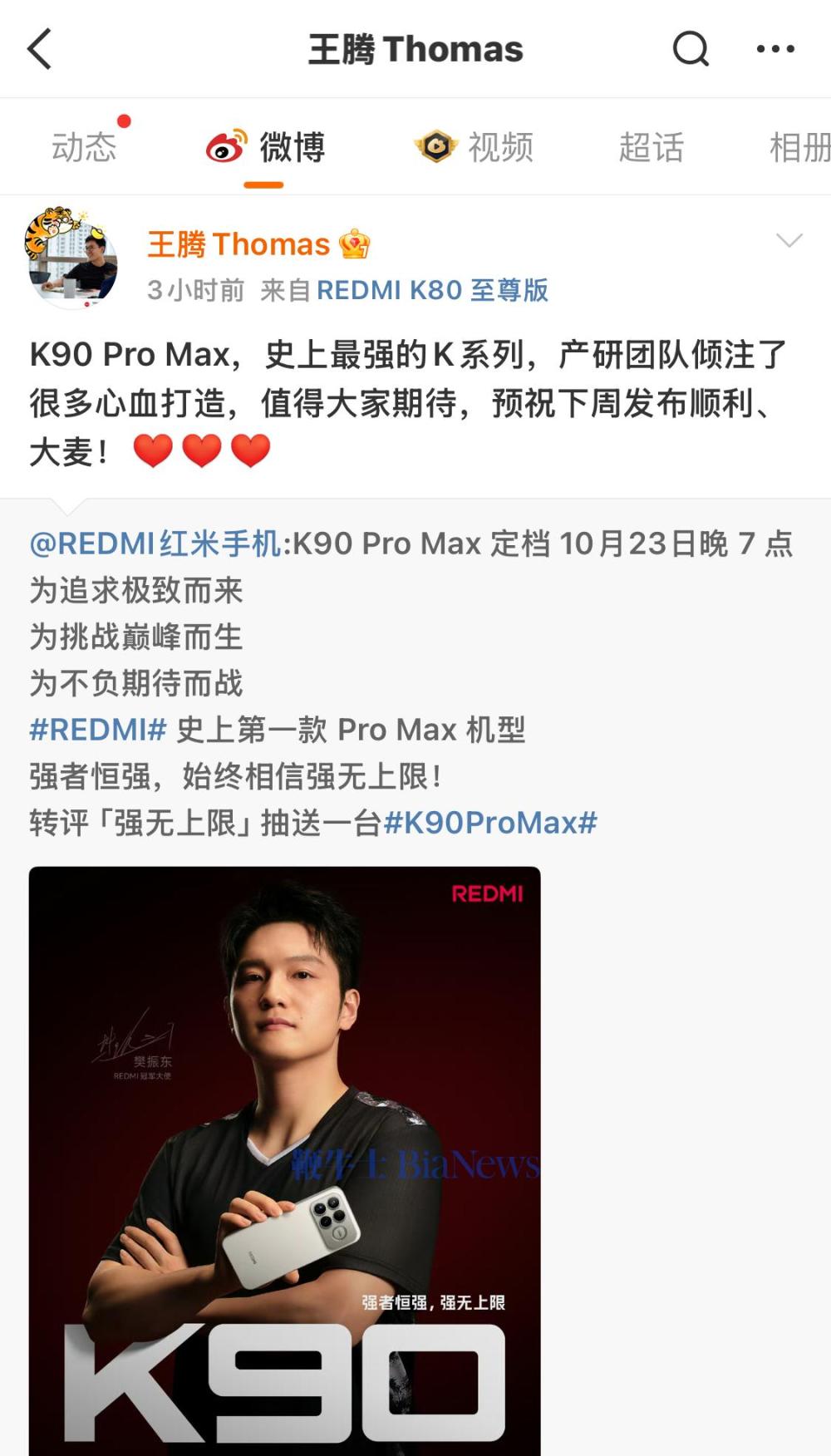 王腾称,“K90ProMax,史上最强的K系列,产研团队倾注了很多心血打造,值得大家期待,预祝下周发布顺利、大麦!”
