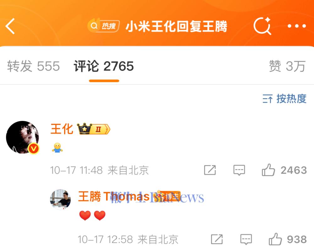 值得注意的是,小米公关部总经理王化在该条微博下方进行了评论,王腾也回复了王化。