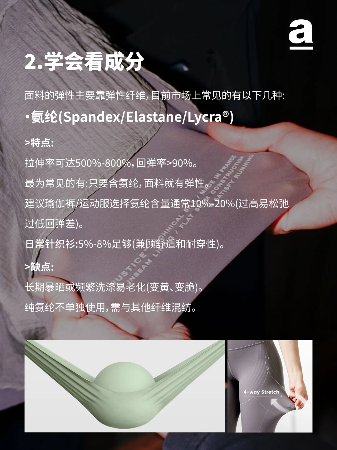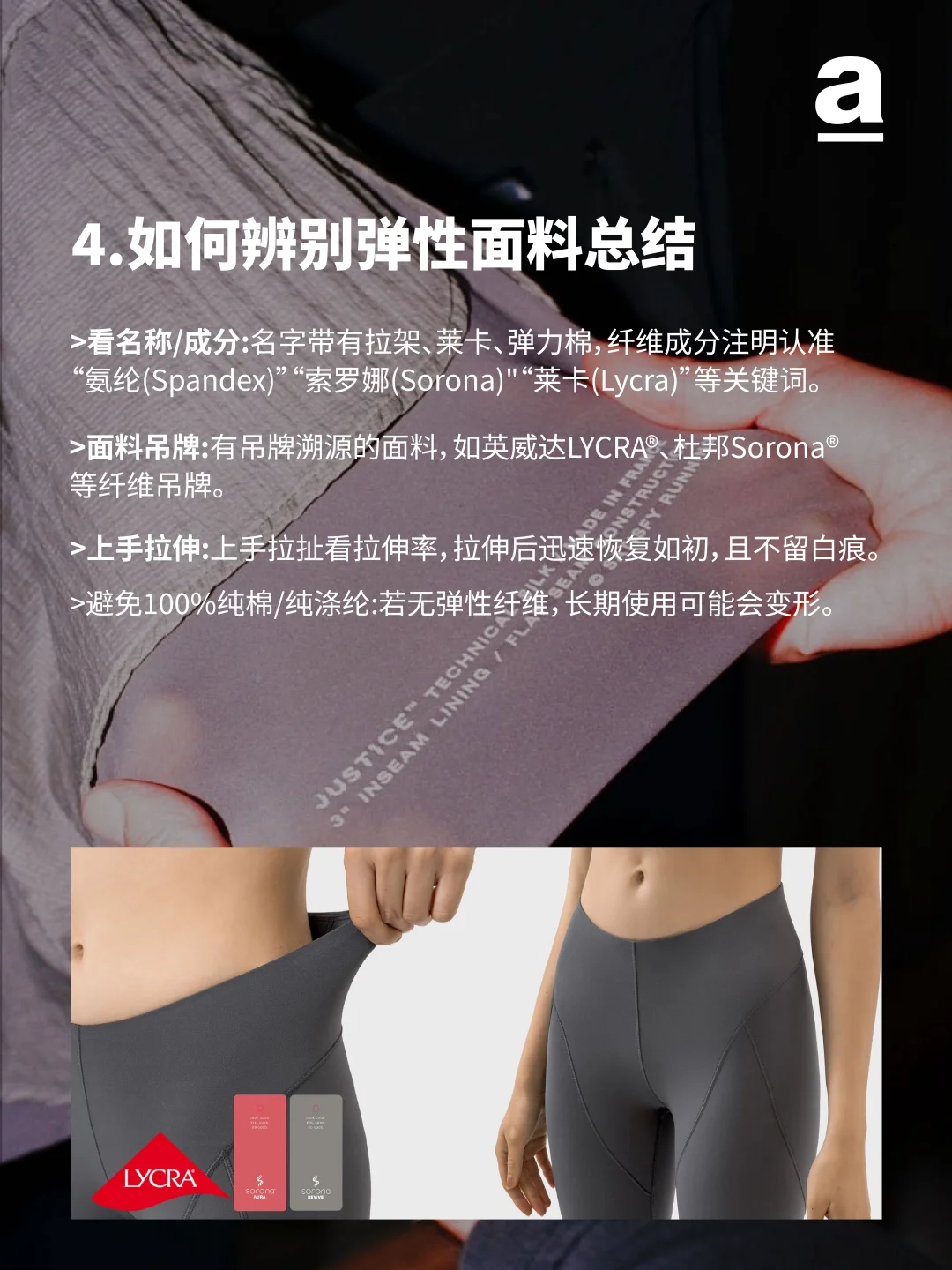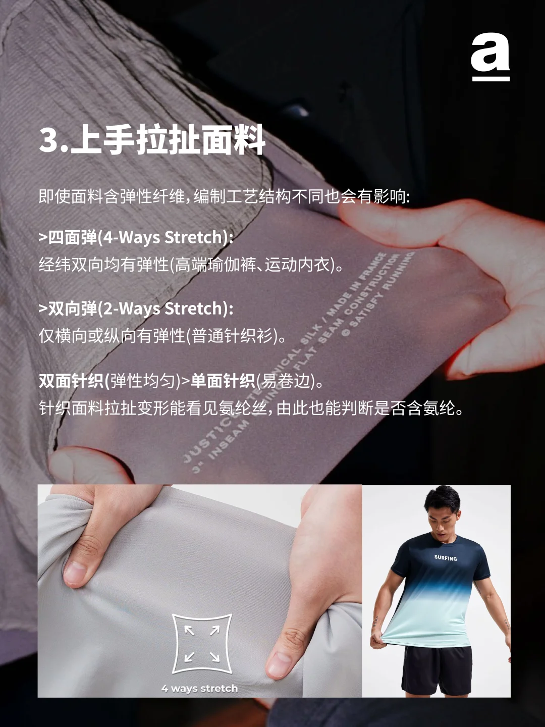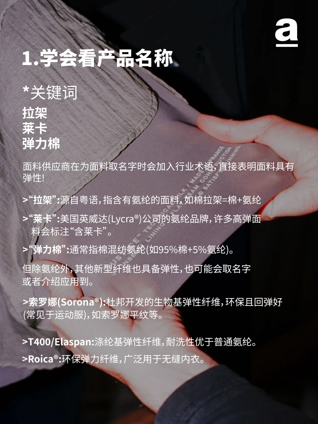 [斜眼R][斜眼R]如何辨别弹性面料总结: 1️⃣看名称/成分:拉架、莱卡、弹力棉,纤维成分注明认准“氨纶(Spandex)”“索罗娜(Sorona)”“莱卡(Lycra)”等关键词。 2️⃣面料吊牌:有吊牌溯源的面料,如英威达LYCRA®、杜邦Sorona®等纤维吊牌。 3️⃣上手拉伸:上手拉扯看拉伸率,拉伸后迅速恢复如初,且不留白痕。