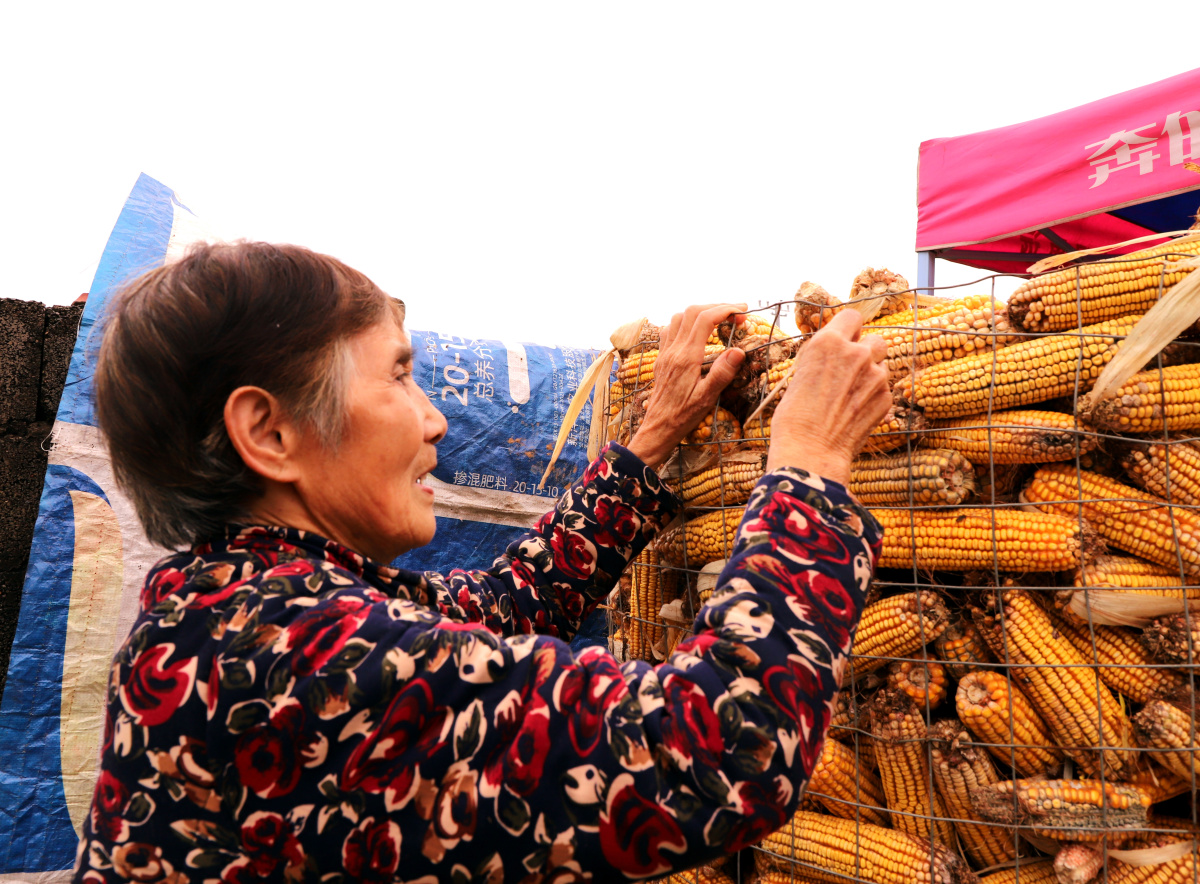 石桥镇肖坟村78岁的余花勺在整理被抢收队抢收回来的玉米