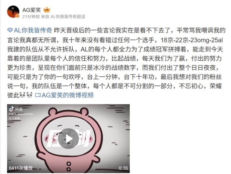 AL的每个人都全力为了成绩冠军拼搏着,能走到今天靠着的是团队里每个人的信任和努力,比起战绩,每天我们为了赢,付出的努力更为珍贵,呈现在你们面前只是冰冷的战绩数字,而我们付出了整个日日夜夜,可能只是为了你的一句欢呼,台上一分钟,台下十年功。