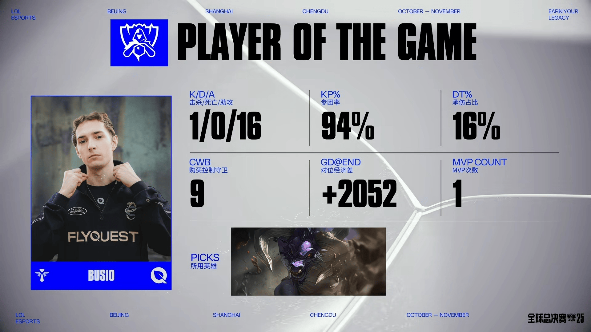 Busio牛头砍下1/0/16的战绩,拿下FLY对阵TSW赛后MVP