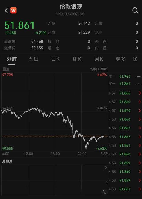 国际银价:伦敦现货白银暴跌超6%,跌破51美元/盎司,创半年最大单日跌幅。