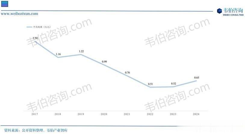 进入2020年后,新设基金的平均规模均未超过1亿元人民币,其中2020年为0.99亿元,2021年进一步降至0.76亿元,2022年更是跌至0.51亿元。2023年新设基金规模虽小幅回升至0.52亿元,但较过往情况仍处于较低水平。2024年出现了新的变化趋势。