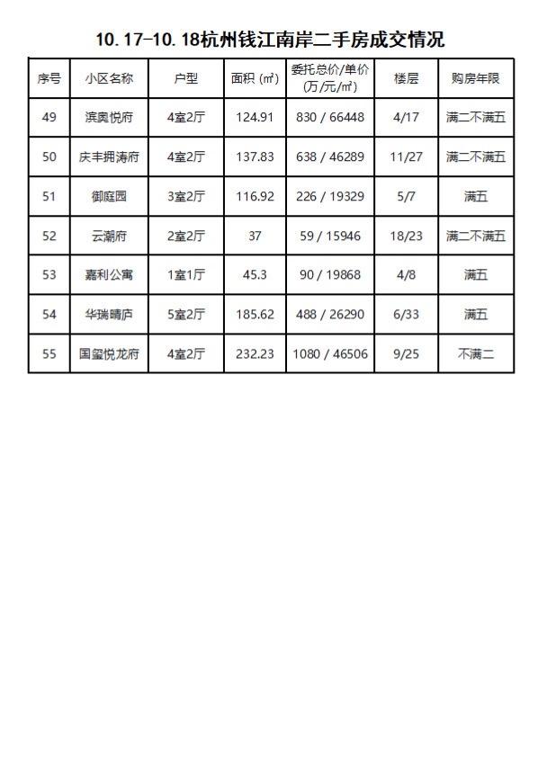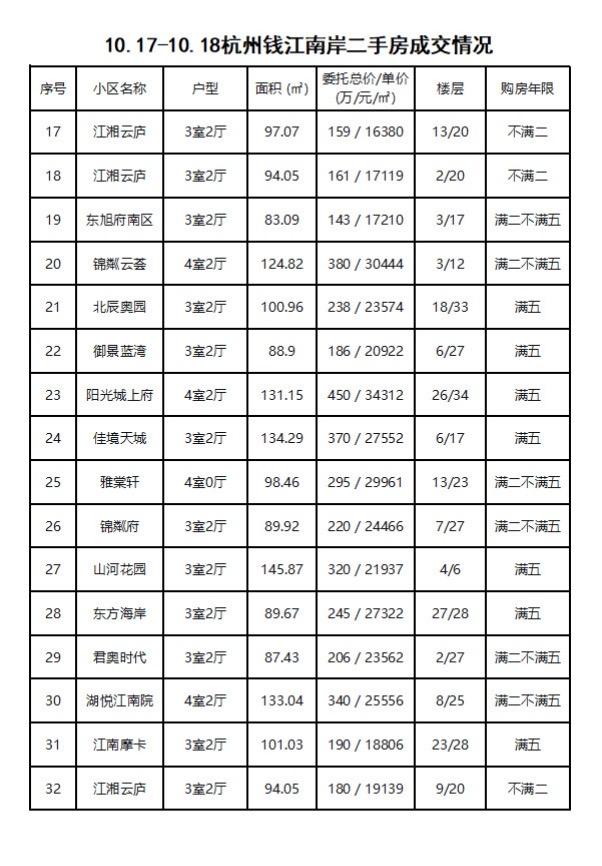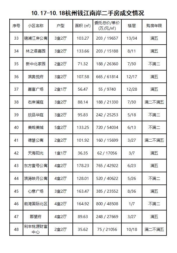 10.17-10.18杭州钱江南岸(滨江和萧山)二手房每日成交数据分享,近两日共成交55套,市场总体以刚需支持!