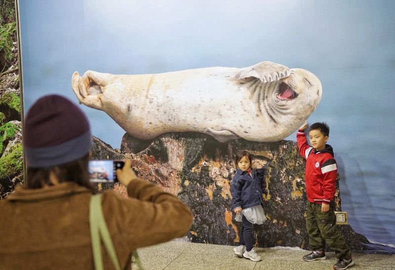 10月18日,北京世纪坛展厅,由中国艺术摄影协会、自然影像中国主办,北京市园林绿化局、北京野生动物保护协会特别支持的“和美家园万物共生”中国野生动物摄影作品巡展暨“京生万物”北京市野生动物摄影作品展开幕。图为小观众在照片前留影。