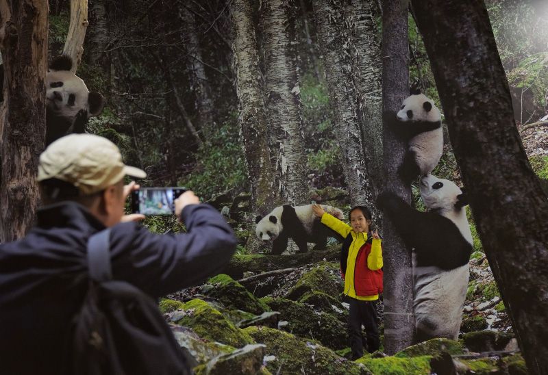 影像打卡墙前,观众与憨态可掬的大熊猫合影。