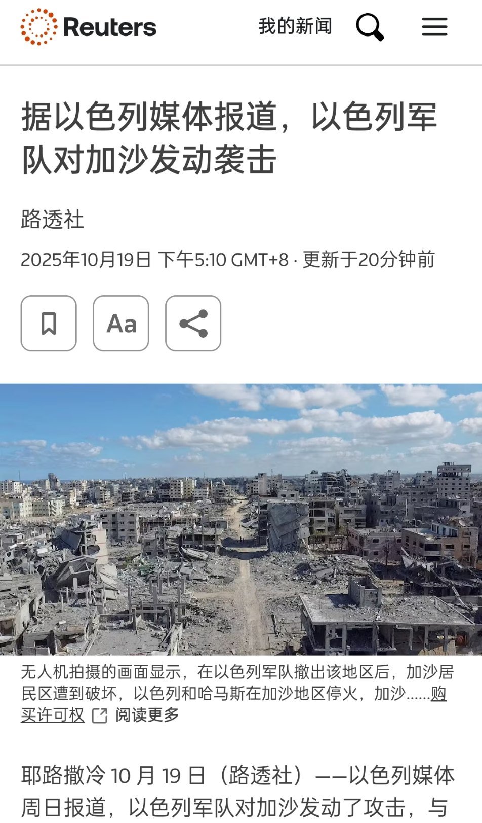 10月10日:以色列批准加沙停火协议。10月19日:以色列对加沙发动袭击。加沙的