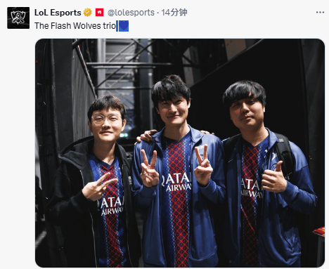 虎扑10月19日讯LOL官推晒Karsa、Betty和Maple合影并配文:闪电狼三人组