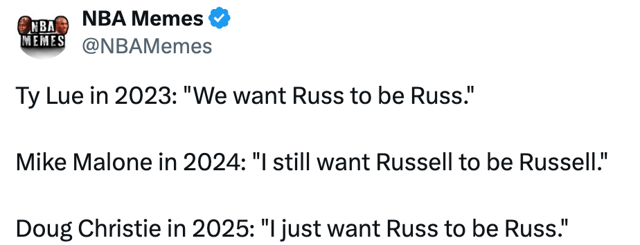 泰伦-卢在2023年曾说:我们想要威斯布鲁克做自己。