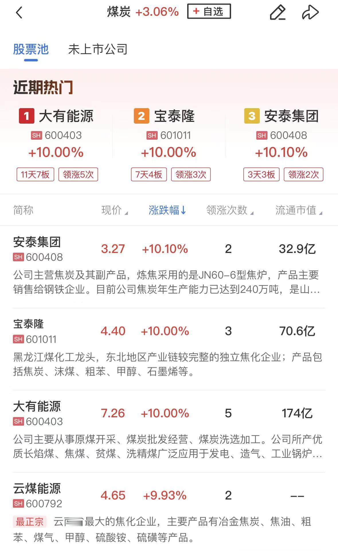 煤炭股延续强势,大有能源7天6板,安泰集团、宝泰隆、云煤能源涨停,郑州煤电、华阳股份、平煤股份涨幅居前。
