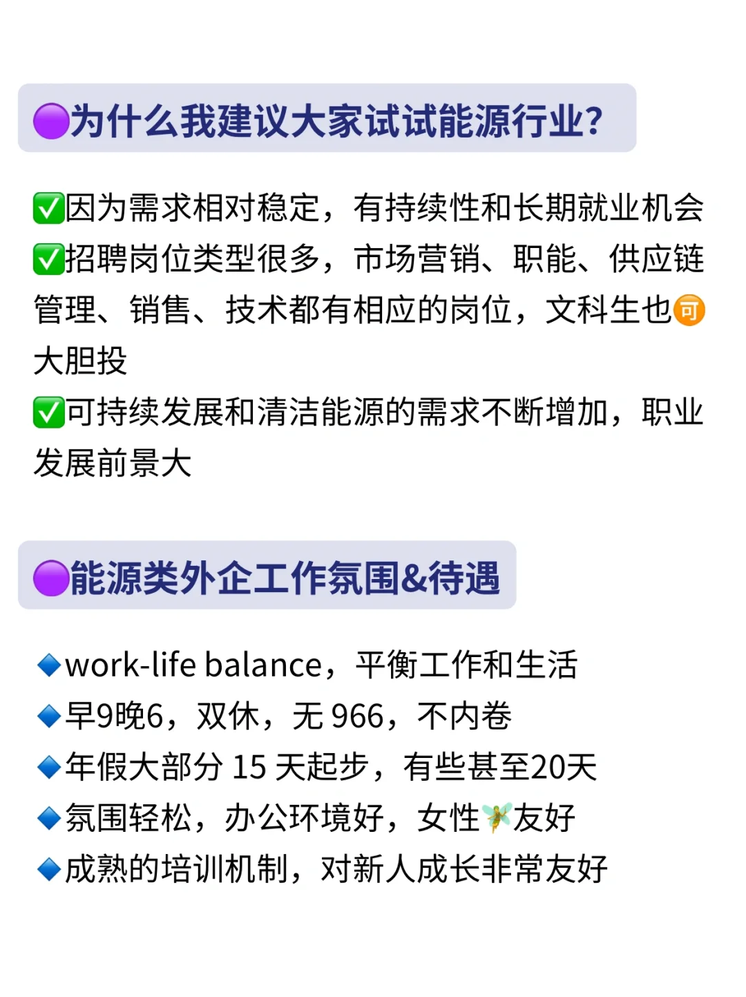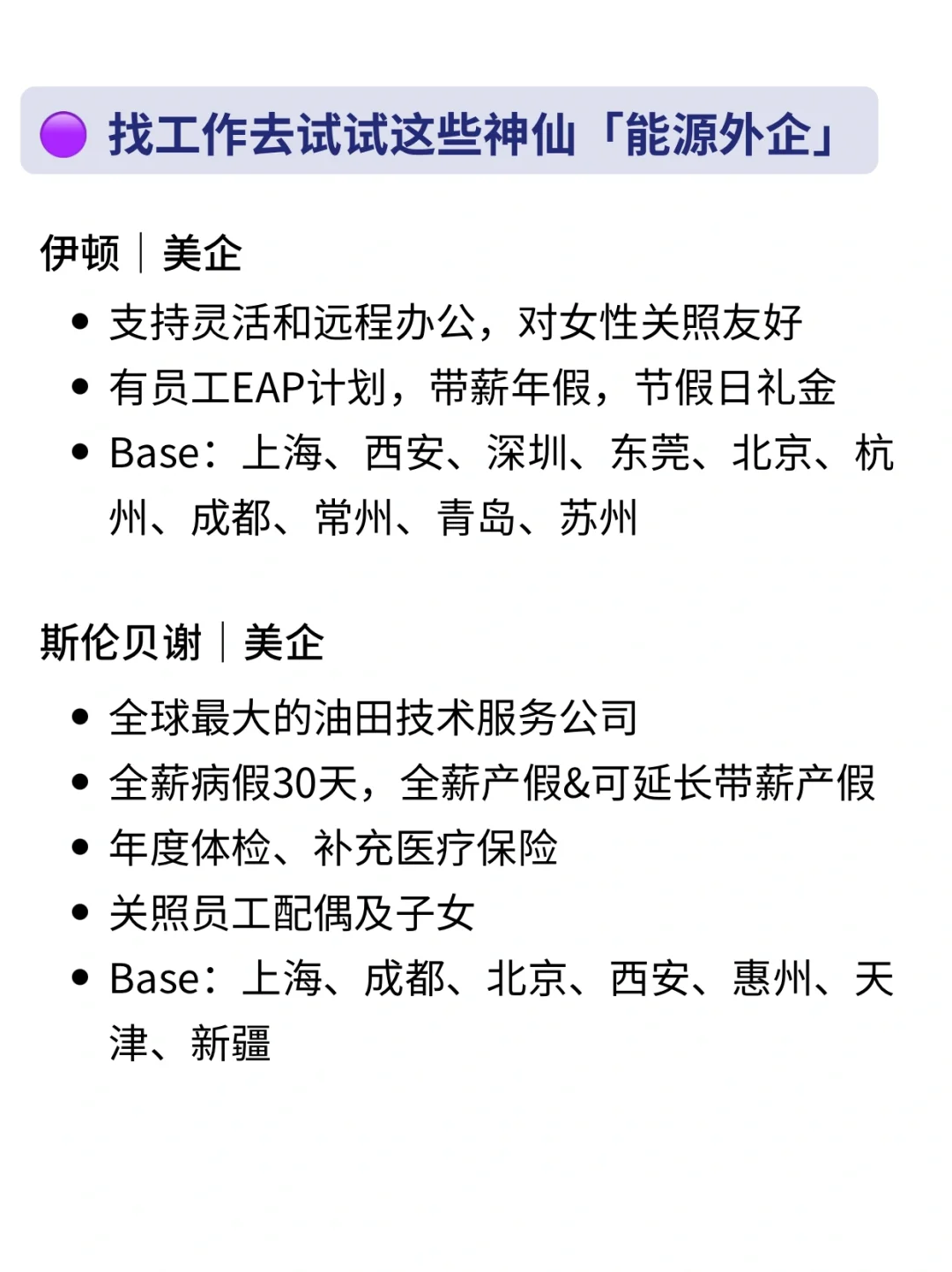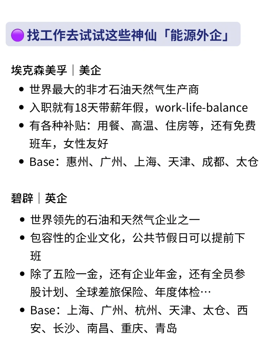 之前给大家提到过不少很值得去的外企,今天继续跟大家聊聊能源类外企 · 🟣为什么我建议大家试试能源行业? 👉因为需求相对稳定,具有持续性和长期就业机会 👉岗位类型很多,市场营销、职能、供应链管理、销售、技术都有相应的岗位,文科生也🉑️大胆投 👉可持续发展和清洁能源的需求不断增加,职业发展前景大 · 🟣这些「能源外企」口碑好值得去(外企list在上图中‼️) 🇺🇸埃克森美孚|美企 入职就有18天带薪年假 work-life-balance 公司提供用餐、高温补、住房补 还有免费班车,女生友好 · 🇬🇧碧辟|英企 世界top的石油和天然气企业 包容的企业文化 公共节假日可以提前下班 · 🇺🇸伊顿|美企 支持灵活和远程办公 对女生关照友好 有员工EAP计划,带薪年假,节假日礼金 · 🇺🇸斯伦贝谢|美企 全薪假期30天 全薪产假&可延长带薪产假 关照员工配偶及子女 · 🙋‍♂️500强外企面试官,带你轻松拿下外企offer 👉(求职版) 了解更多求职外企的野路子 👍往期干货: ✅外企面试被问:什么是Marketing? ✅求职找工作,一不小心进了:小而美香料外企 ✅挪威外企过于冷门了,实际上很好进 ✅Marketing面试被问:什么是整合营销? ✅外企英文面试,建议大家每天都看一遍 -