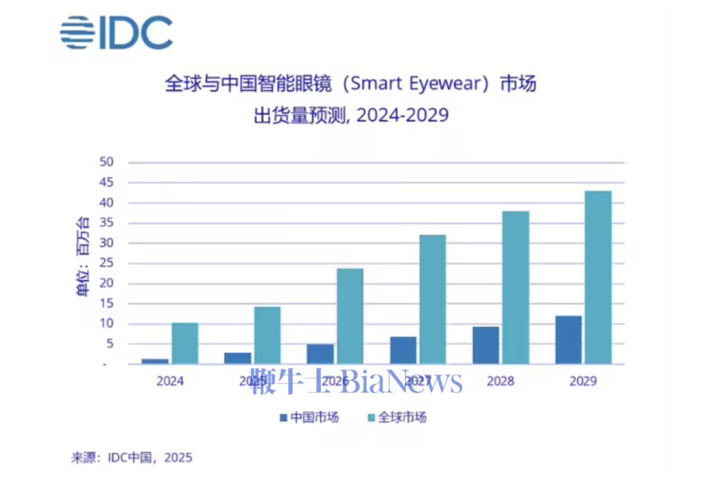 IDC预计,到2029年,全球智能眼镜市场出货量将突破4000万台。其中,中国市场份额预计五年复合增长率(2024-2029)将达到55.6%,增速位居全球首位。