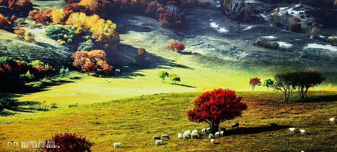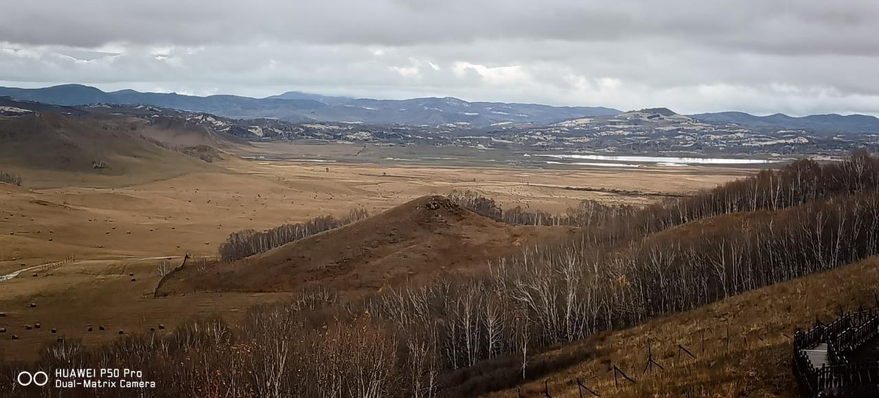 秋雨后的乌兰布统,不一样的感觉,丹青水墨让人流连忘返! 10.9日上午,一夜中雨后的乌兰布统:云横天际、乌鸦与鸥鹭齐飞,草色烟山,凉风和彩林共舞! 秋云绕梁,漫坡牛羊,《还珠格格》片中曲:你是风儿我是沙,缠缠绵绵到天涯,让人想起五阿哥、尔康和紫薇林心茹、还珠赵薇! 爱的向往、爱的纯粹,爱的就像这乌兰布统的阴天,愁绪和泪、寸断肝肠! 公主湖的那一滴泪,家国情仇几百年!一尊雕像,可怜蓝齐格格,细雨绵绵中还在独自哭泣! 将军泡子,阴霾天际,仿佛铁马金戈、将军白发,古战场刀光剑影,化作草地深处一潭秋水! 五彩山云遮雾罩,似彩非彩,烟波飘渺,仙境传说一般。 深秋雨后,乌兰布统别有滋味,不输金色艳阳,让人回味无尽!