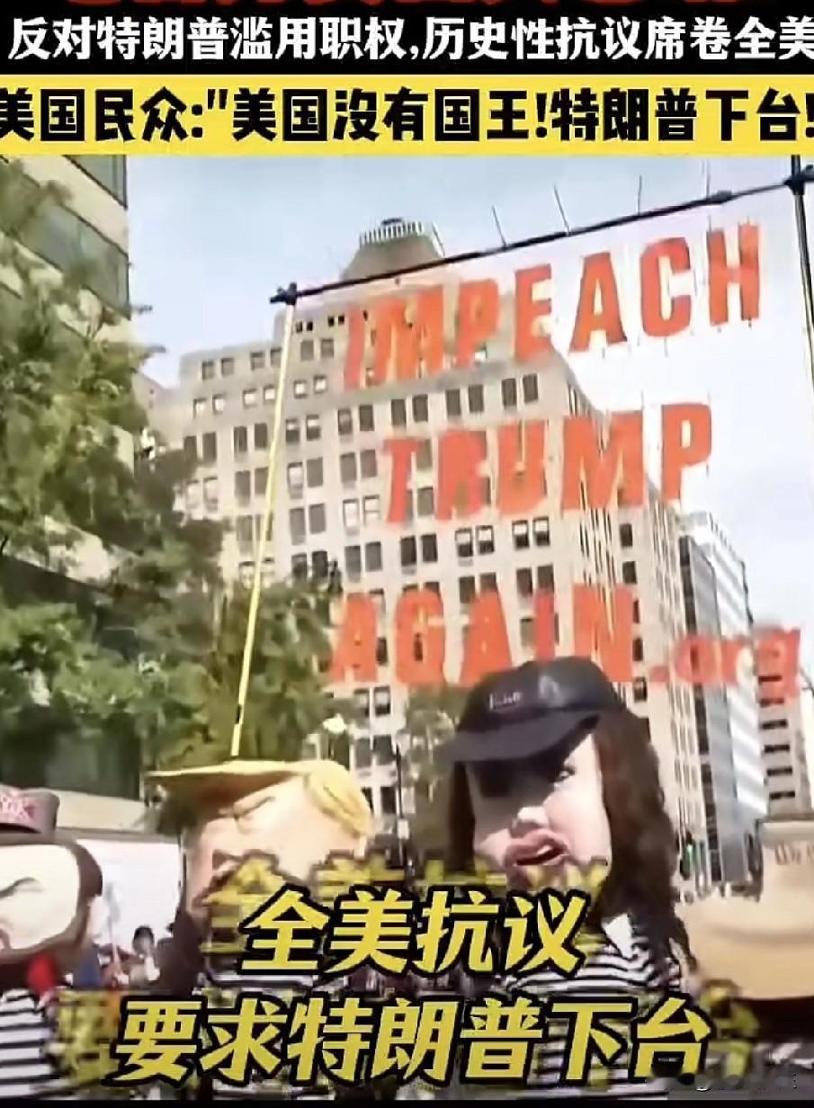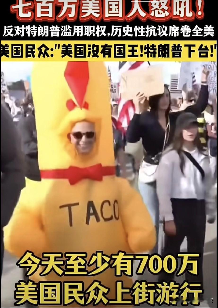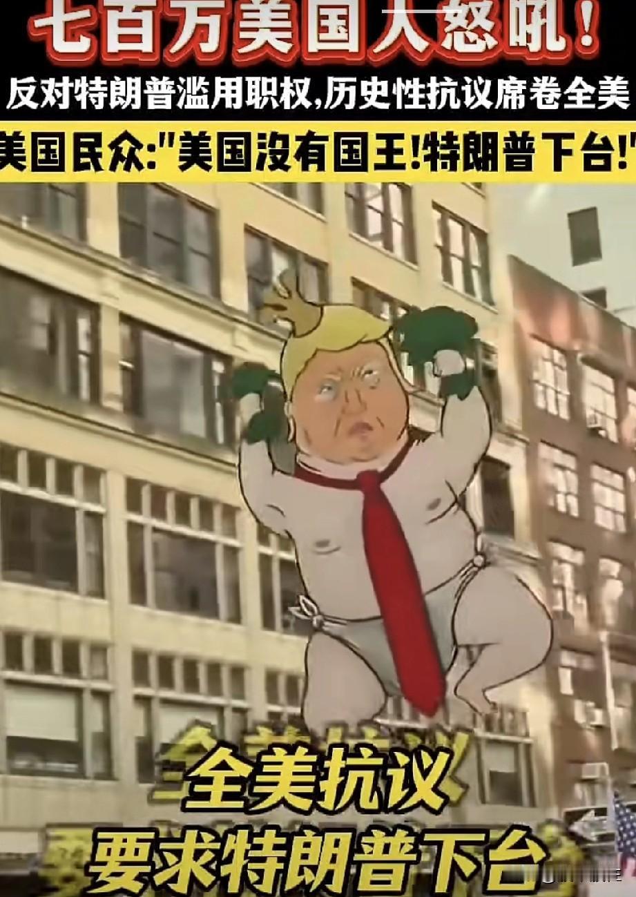 乱了吗? 金毛慌不慌? 美国民众超700万人大游行,抗议特朗普,强烈要求特朗普下台。呼吁他们不需要“国王”! 美国政府已经关门19天了,特朗普不但内斗在行,外斗也不落下。大多数美国人民也不是傻子,他的所作所为确实把民众惹毛了。美国全国各地爆发游行,要求金毛下台。他们不需要国王。 看看特朗普2.0版上台后,到底给美国人民带来了什么实实在在的好处?天天嘴炮世界第一,自己家族的财富倒是增长了不少,还有他的密友们财富也增长了不少。而美国人民获得了什么? 金毛的支持率越来越低,关税战跟我们是打不下去了。俄乌的热战,金毛站在小乌一边也打不赢。现在求着见八零后,八零后也不见他。真是王炸开局,最后一地鸡毛啊。