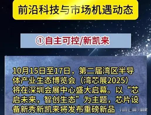 今天怎么操作? 昨天科创50指数阴包阳,受美股下跌影响今天低开是大概率事件,如大幅低开,是机会,不是风险,有仓位的不要割肉在地板。 看看美股——纳斯达克下跌📉0.76%,英伟达跌超4%,英特尔跌超4%,Strategy、Coinbase跌超4%,日月光半导体跌超3%,美光科技、Arm跌超2%。 纳斯达克中国金龙指数收跌1.95%,蔚来跌超5%,百度跌超4%,哔哩哔哩跌超3%。 目前资金有些恐高,重新回流老登股,小登股昨天大幅杀跌,今天开盘下杀就是机会,不要忘了今天还有惊喜——新凯来! 10月15日至17日,第二届湾区半导体产业生态博览会(湾芯展2025)开幕了!以“芯启未来,智创生态”为主题,开创自主可控,国产地带新风向,彻底打破美西方围堵封锁!