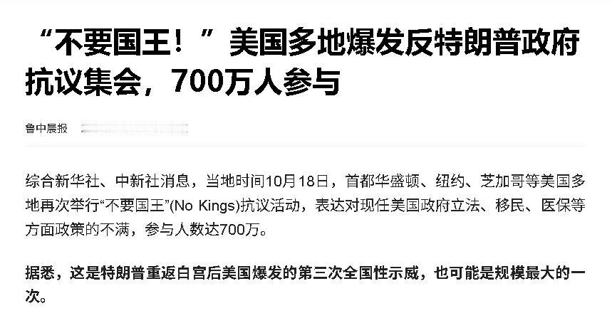 [下雨]出大事了,特朗普位置怕是要坐不稳了!10月18日,美国多地爆发以“不要国王”为主题的大规模反特朗普政府全国性示威,抗议活动,人数高达700万。这场席卷全美的风暴,核心引爆点已经不是什么驴象两党的左右互搏了,这是一场更深层次的信任危机 美国政府因为资金无法到位已经停了十八天,这不仅让许多部门的工作人员被迫休假,还让重要的安全管理和法律事务停滞, 平日里大家默默忍受,但这回连管理核武器库的员工都没了工资,法院的咨询和服务也打了烊,一系列连锁反应让普通人感受到了切身影响。 社会服务中断,基础工程项目资金被冻结,大大小小的生活难题扑面而来,大家心中的不安和愤怒迅速堆积。 这些问题反而让人们对现政府的信任出现了裂痕,民间的情绪一天天高涨,议论从家门口蔓延到网络,再到社区集会,最终变成了全国性的抗议浪潮。 抗议者不分年龄和身份,他们走上街头,不再是为了党派争斗,而是为了一句“不要国王”的共识,他们想要重新确认政府的责任和宪法赋予的权利。 从波士顿到芝加哥,从德州到加州,人们用行动表达自己的诉求,这股力量很快遍布全国,一共吸引了700万人参加,成为几十年来最大的民意爆发。 组织者没有把这场行动变成某党派的专利,他们打破地域界限,鼓励每一个被停摆影响的人站出来表达不满。 有的人在海滩身体拼字,有的在公园里签名展现宪法的开头话语,大家都希望政府能看到人民的诉求。如此大规模的参与,说明问题已经不只是经济层面的压力,而是关乎制度本身的危机。 随着队伍不断壮大,现场的气氛从最初的质问,发展到一种对宪法权利的重新肯定,大家更关心政府的态度是否会发生改变。 面对全国上下的民意汹涌,政府高层表现出了明显的紧张和抵触,议长和相关官员的表态都不是在解决实际问题,更多像是在给抗议行动定性,称其是对国家的不忠。 这种处理方式让许多普通人觉得,自身的诉求不仅没有被正视,反而被有意淡化甚至批评。 特朗普站出来说自己不是独裁者,但这句解释并没有得到大家认可,反而引发更多疑问。人们开始质疑,政府是不是已经脱离了群众的实际需求,只关注政治博弈的输赢。 随着政府迟迟未能给出有效的方案,停摆造成的不便继续发酵,越来越多的人感受到影响。 这时候宪法被大家搬出来强调自身的集会和表达权利,现场的横幅和签名都在向政府传达一个信息:这个国家归属于人民,每一个人都需要被听见和尊重。大家在不断的行动中找到了团结,同时也对未来的民主制度有了新的理解。 整个示威过程不仅展现了民众的集体觉醒,更让人们开始思考怎样才能推动社会向好的方向发展。政府现有的回应方式,使得总统位置显得越来越不稳,民众的质疑不会因为一两句声明就消失。 如果不能及时解决停摆带来的问题,可能还会激发更多的集会和抗议,影响全美的局势。 如今示威已经超越了党派,变成了每个普通公民捍卫自身权益和民主制度的必然行动。只有当政府能真正倾听民众的声音,问题才有可能被解决下去。