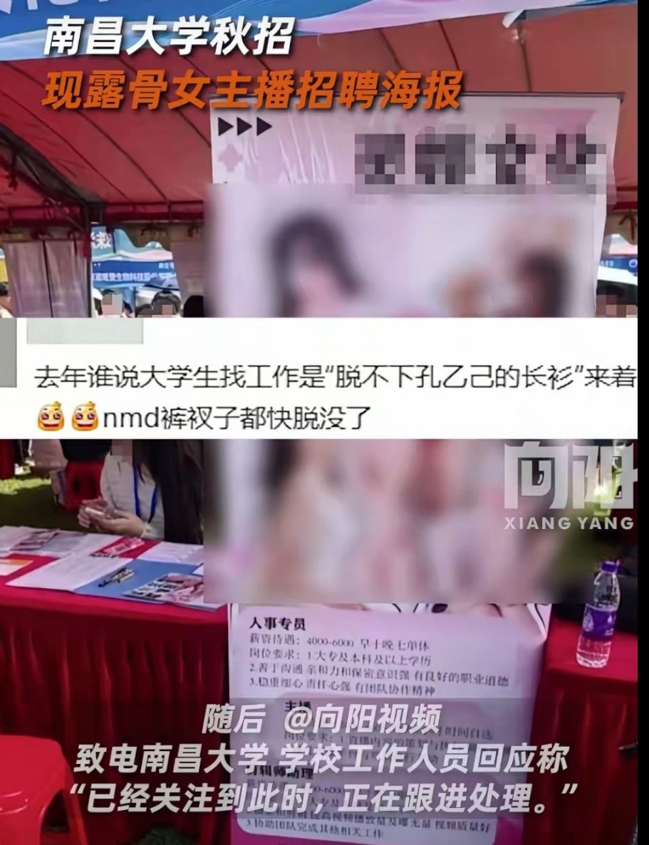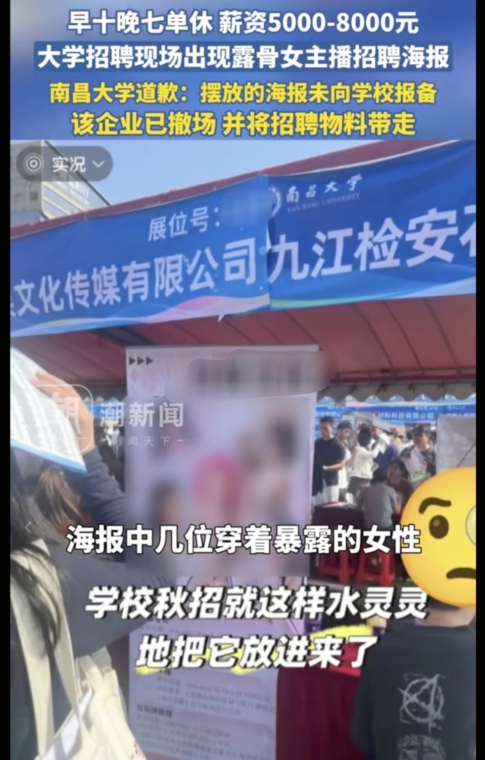南昌大学致歉网传南昌大学秋招现场,一公司招主播岗位时摆放年轻漂亮露骨女主播的海报