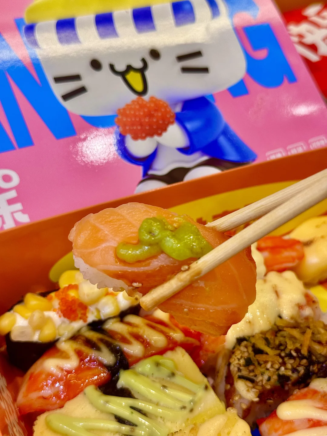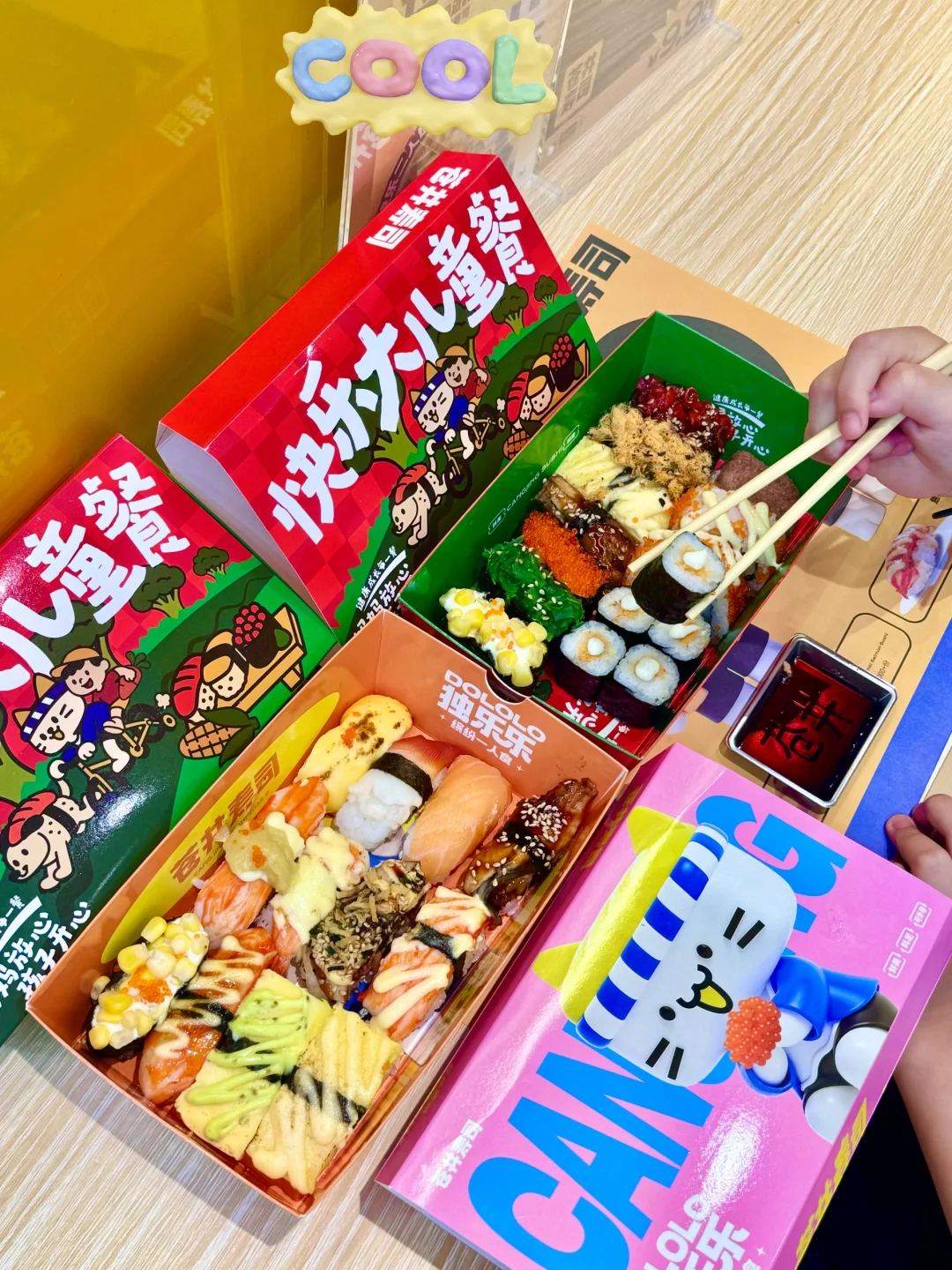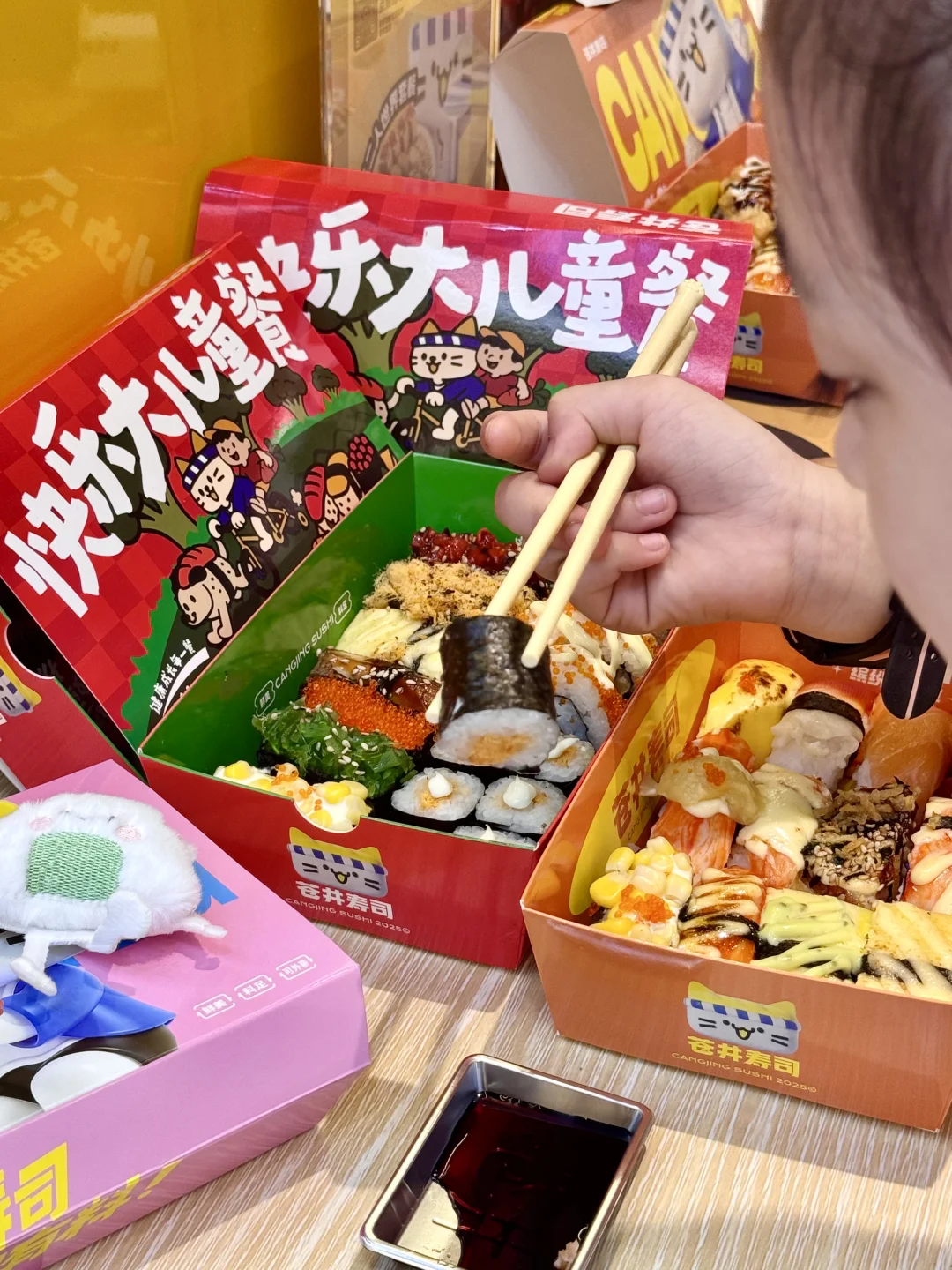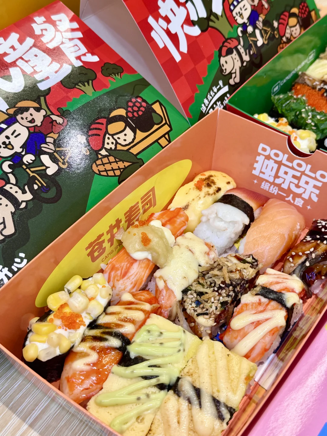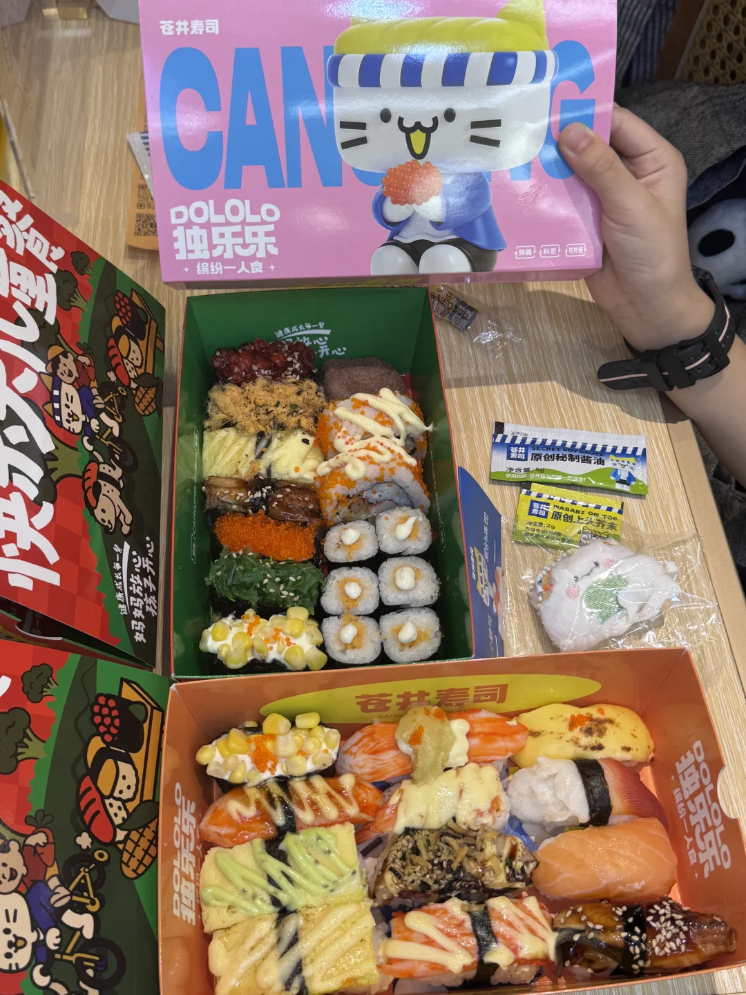 啊啊啊啊!这家买寿司🍱的人暴多啊! 我也去凑热闹了 哈哈😂 带上我的娃就冲了过去 拿下(全熟系列)儿童套餐一份29r搞定一大盒✌️ 我选择了39元任选12件✌️太划算了吧 颜色搭配还蛮好看的 hhhh😄 榴莲味的寿司我第一次吃!榴莲与蟹肉相互碰撞的味道好特别呀😌👌 而且新店开业买套餐还送周边猫爪筷子🥢一副 可把月牙开心🥳坏了! 周末带宝宝就是正佳广场最好玩最好吃了😋 店铺就在正佳广场负一层~~~ 正佳广场周末去哪儿带娃周边游广州寿司广州美食正佳广场美食苍井寿司聚餐日自选寿司人均30苍井寿司新店开业
