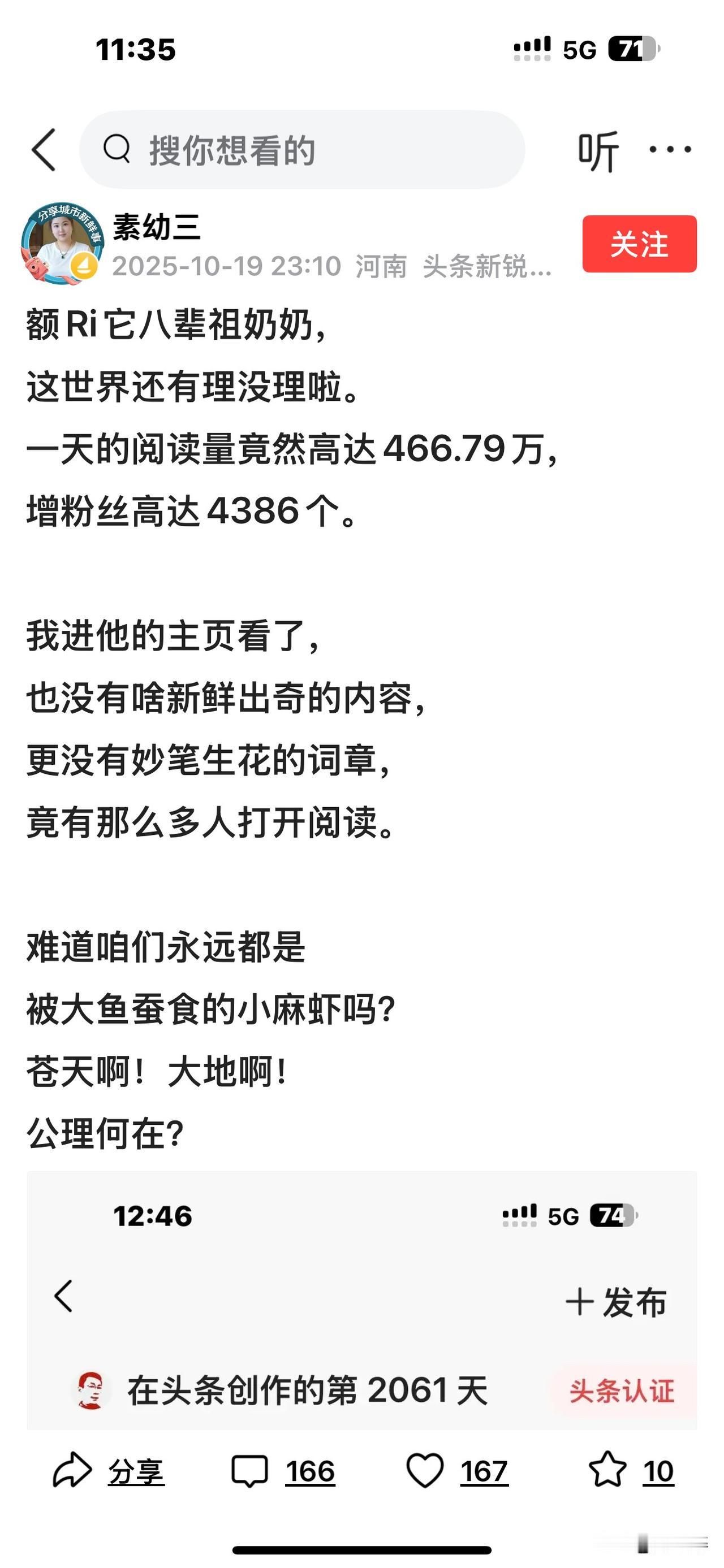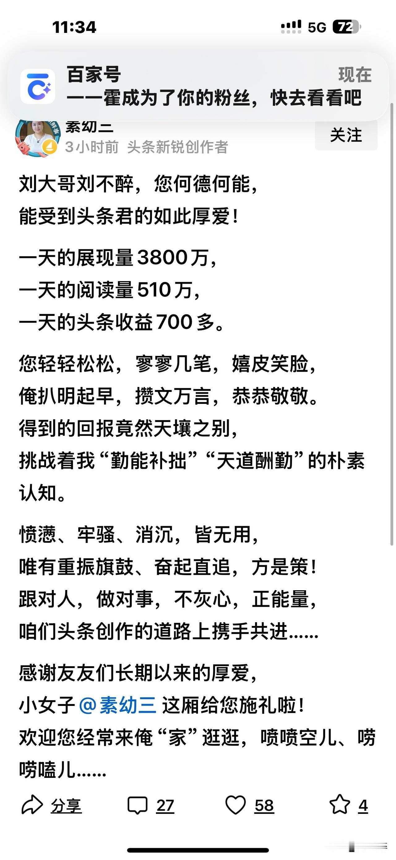 这几日,我被条友“素幼三”盯上了[捂脸] 她连着发了好几个帖子,质疑我“何德何能”! 我想,友友素幼三误会我了。 我压根没有“讥刺头条规则”的意思,更没有“嘲笑网友智商低”的念头。 一直以来,我把读者当作珍宝,将粉丝视为上帝。没了他们,就没有今天的我。 平台极为公平,对待每一位创作者都一视同仁。只要付出,就会有收获! 我才疏学浅,向来不爱显摆自己。 我是80年代的师范生,并非文人墨客!我写贴文时严格遵守平台规则,绝不敢越雷池半步!这是我的基本准则与底线,此为其一;其二,我坚持实事求是,是怎样就怎样说,绝不妄自揣测。 我深信,不管写什么内容,不管文风怎样,写出来的东西,只要能得到读友欣赏,引发共鸣,那便是佳作。反之,就只是一堆无人搭理的废纸。