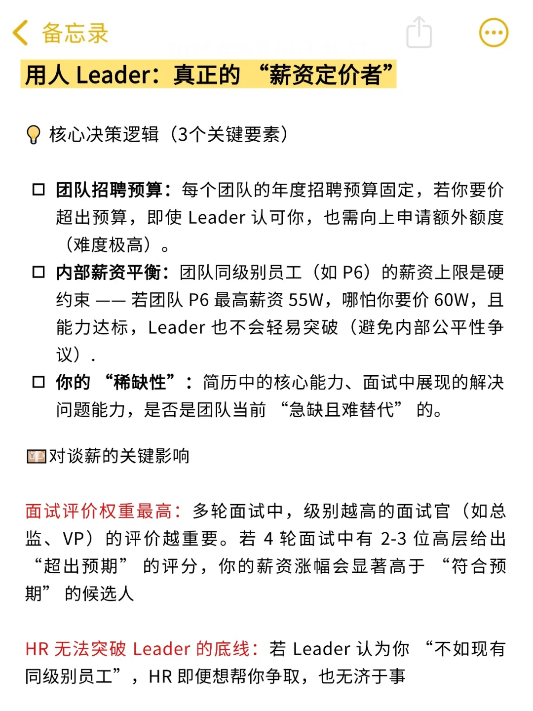 Leader 定薪会看四点:你的能力是否稀缺、有没有晋升潜力、同级别同事薪资多少、团队年度预算够不够。要是你掌握的技能难替代,Leader 甚至会主动申请特例额度;可要是你能力和现有成员差不多,还要求远超内部水平的薪资,就算 HR 想帮你,也很难说动 Leader✅。