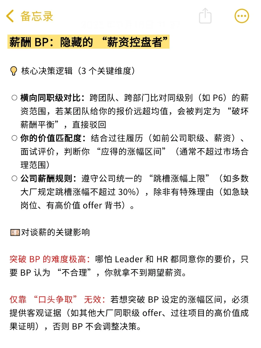 这个角色不直接对接你,却握着薪资审批的关键钥匙🔑。他们的核心工作是确保薪资结构合理、同职级薪资均衡,避免有人薪资太高引发内部不满。之前有求职者拿到口头 offer,就因为薪酬 BP 觉得他薪资涨幅超 30%、不符合同职级区间,最后只能调整方案❌。哪怕 Leader 认可你,BP 不松口,谈判也会卡住。