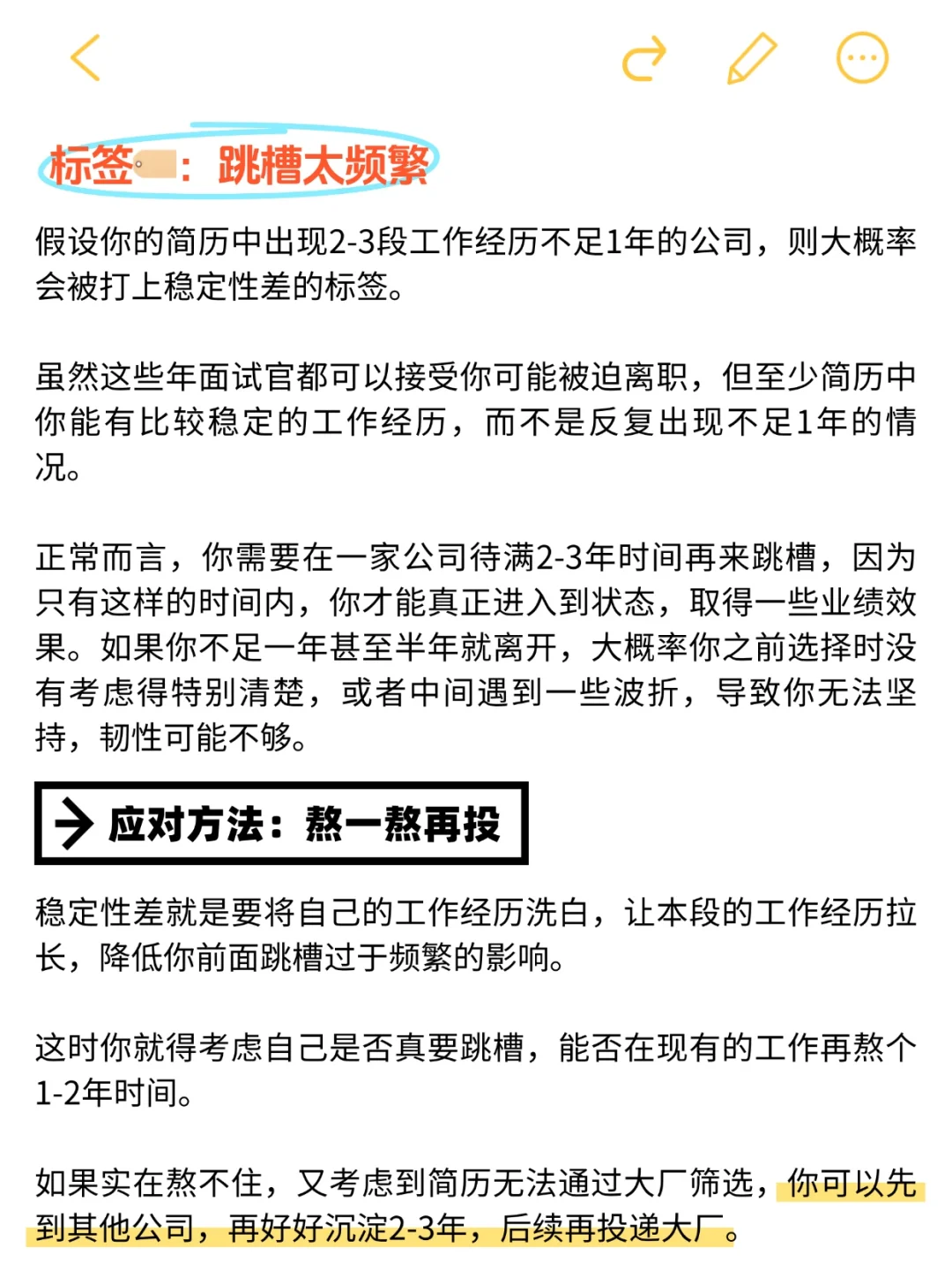 ▪️时间管理:当前工作坚持>2年后再跳槽,淡化短期经历▪️技巧*:合并短期同领域经历(如2020.1-2020.6与2020.7-2021.1的同类工作可合并为“2020-2021年于X行业担任 XX”)。