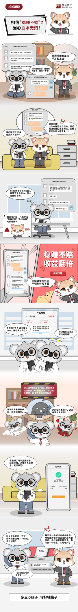 为积极响应中国证券投资基金业协会关于2025年“世界投资者周”活动的号召,秉持金融服务社会的责任感,磐松资产于近日精心策划并制作了一幅以“警惕‘登门槛’效应,做理性投资者”为主题的投资者保护教育条漫。该作品旨在通过通俗易懂、生动有趣的漫画形式,揭露不法分子常用的金融骗术,切实提升广大投资者的风险识别与防范能力。