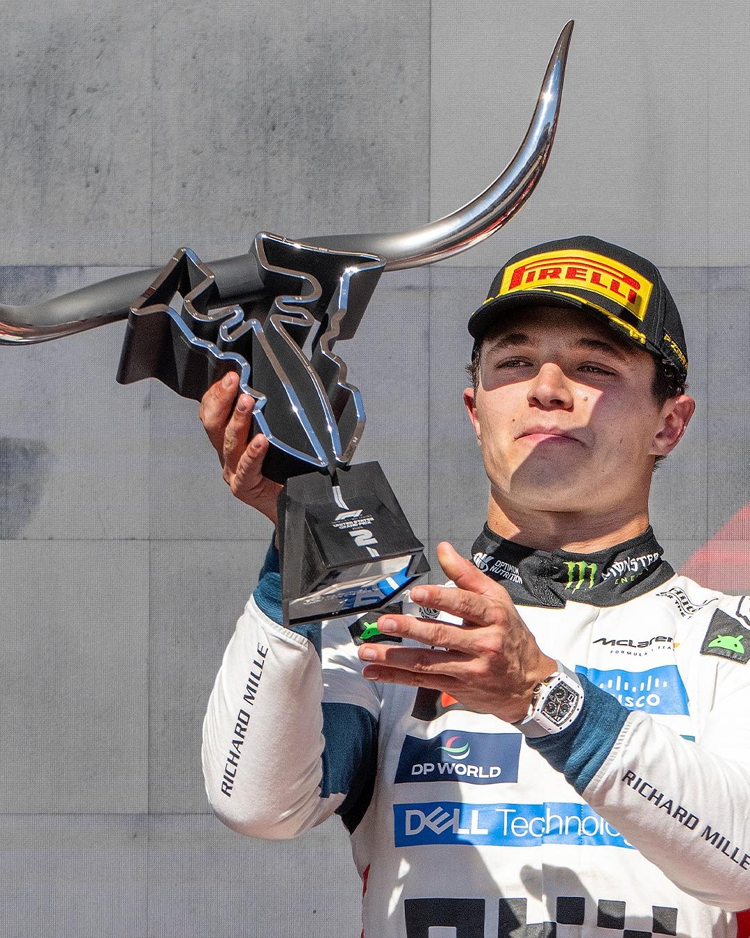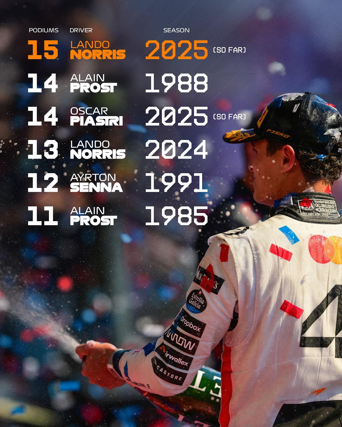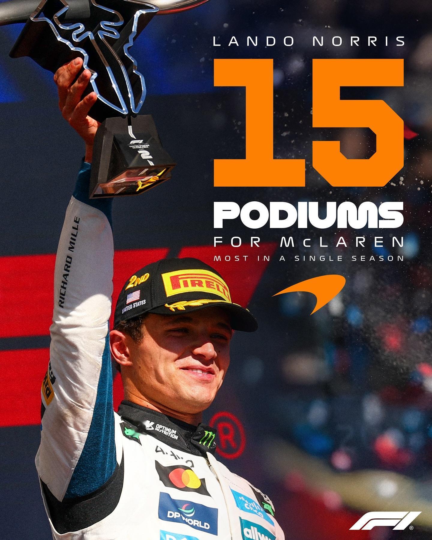 F1官方报道称:“迈凯伦车队此前从未有车手在单赛季取得15次领奖台的成绩,直到诺里斯的诞生!”