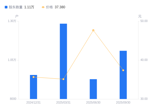 日期A股户数(户)流通A股户均持股数(股)户均持股市值(万元)2025-09-30110988514.4031.832025-06-3092757985.0838.062025-03-31128395768.4920.252024-12-3195437760.8327.662024-09-30124035971.2720.222024-06-30131485632.9213.542024-03-31149594950.9714.852023-12-31138415350.8921.032023-09-30150574918.7519.072023-06-3065333071.3916.64