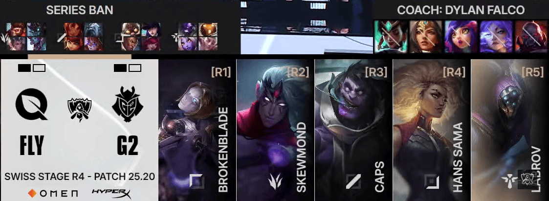 G2选用:Brokenblade贾克斯、SkewMond蒙多、Caps发条、HansSama韦鲁斯、Labrov芮尔