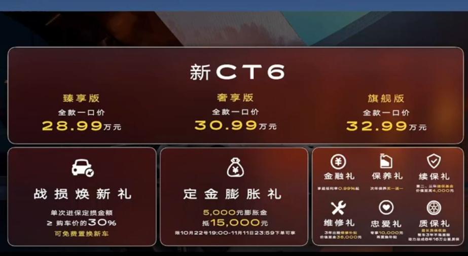 28.99-32.99万,新凯迪拉克CT6还值得期待吗 新凯迪拉克CT6 基础参数:5223*1890*1473 mm,轴距3109mm(C级轿车) 发动机:2.0T 功率:174kW 驱动形式:后驱 变速箱:纵置10AT变速箱 百公里加速:7.47s 底盘:磁浮底盘 悬架:铝制前双叉臂后多连杆 车机芯片:高通8155 油箱:72L 汽油:95号 行李箱空间:508L 显示:HUD+33寸环幕屏+高清流媒体后视镜 音响:AKG音响 预售配置: 28.99万 臻享版 真皮方向盘+加热+换挡拨片、直列LED大灯、全景天窗 18寸轮毂、防炫目后视镜、8扬声器 环保打孔皮座椅+前排通风加热、双区自动空调、手机无线充电、256色氛围灯 30.99万 奢享版 19寸轮毂、发光门把手、AKG音响(19扬)、头枕音响、Vnc噪音补偿、远程遥控启动、前排座椅腰托+加热、三区自动空调、副驾老板键、后排座椅加热 32.99万 旗舰版 APA自动泊车辅助、电磁悬挂、HUD、流媒体后视镜、Nappa真皮座椅、感应行李箱 预售礼 5000抵扣1.5万 10000元置换补贴 30%战损换新 教授觉得这价格和目前的配置,还是有一定的空间的,虽然说全铝车身和底盘了,但价位的话依然是对标5.6.E,打一个价格差。但是现在市场竞争那么激烈,这价格还得下个1-2万才能谈。 凯迪拉克[话题] 凯迪拉克CT6[话题] CT6[话题] 凯迪拉克ct6[话题] ct6[话题]【来自懂车帝车友圈】