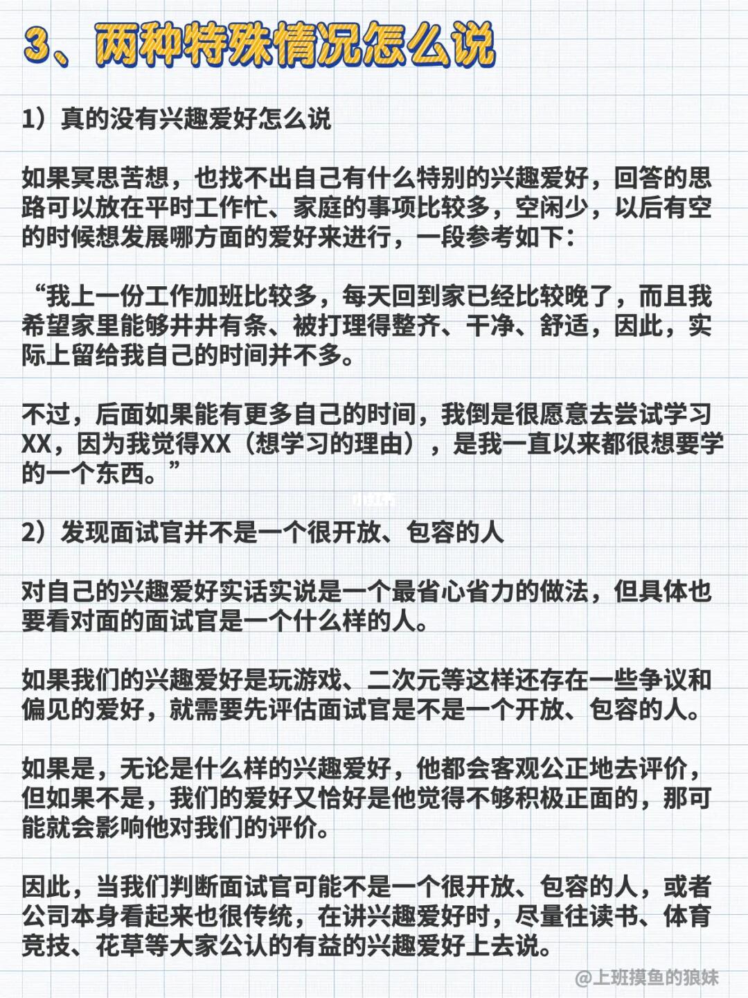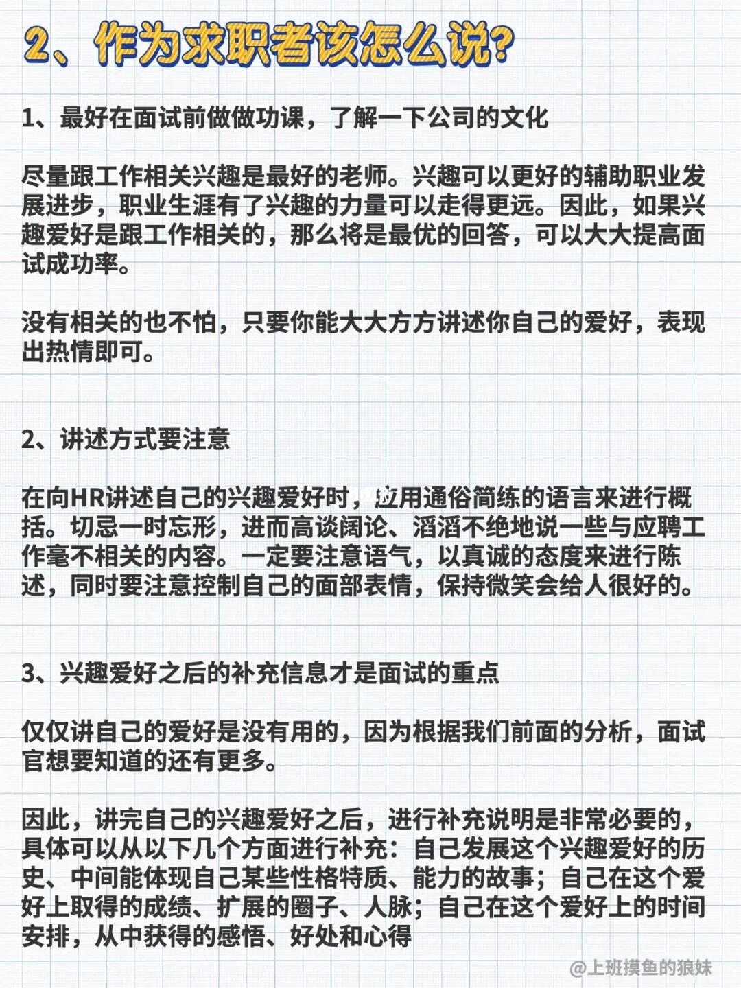 这些回答面试官都听一百遍了,他要听的不是你仅仅回答喜欢做什么,更是你发展这个兴趣爱好的历史、中间能体现自己某些性格特质、能力的故事;你在这个爱好上取得的成绩、扩展的圈子、人脉;你在这个爱好上的时间安排,从中获得的感悟、好处和心得。