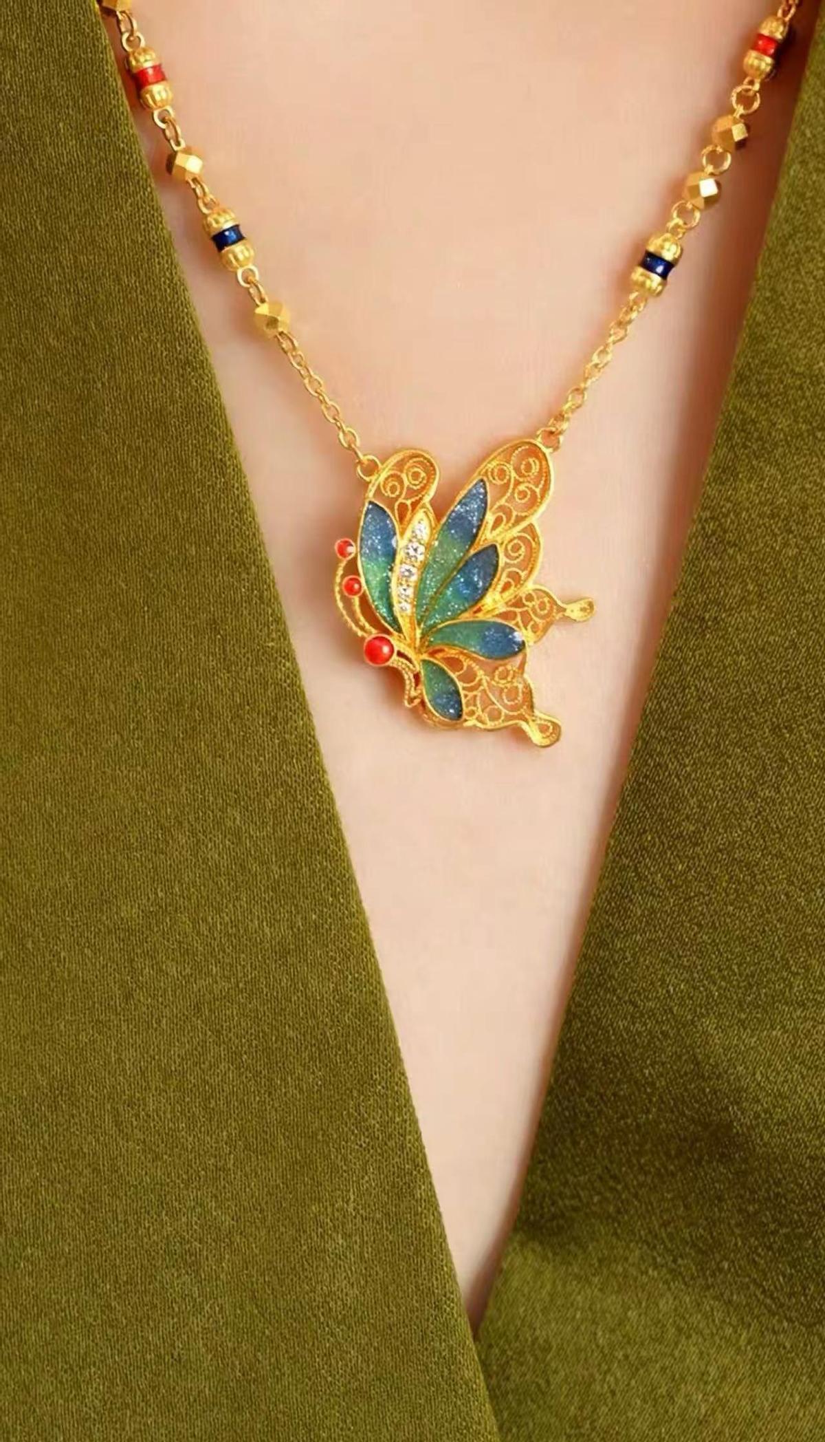 蝴蝶飞进敦煌了。 六福珠宝不卖金子了,卖壁画。 古法金不亮了,反而像莫高窟墙上的泥金,哑着光,藏着千年风沙。 珐琅彩不是随便涂的,是321窟里挖出来的矿物色,青金石、朱砂、石绿,一笔都不能错。 蝴蝶翅膀能转,不是为了炫技,是让你低头时,它真能动一下,像画里那只会飞的魂。 买一套,送你一个NFT,手机一扫,蝴蝶从壁画里扑出来,绕着你脖子飞。 这不是饰品,是能戴在身上的数字文物。 成都SKP一开售,2025套秒光。 不是人疯了,是文化终于有人肯认真接住了。 以前说新中式,是旗袍配金链子。 现在呢? 是金子自己长出了敦煌的呼吸。
