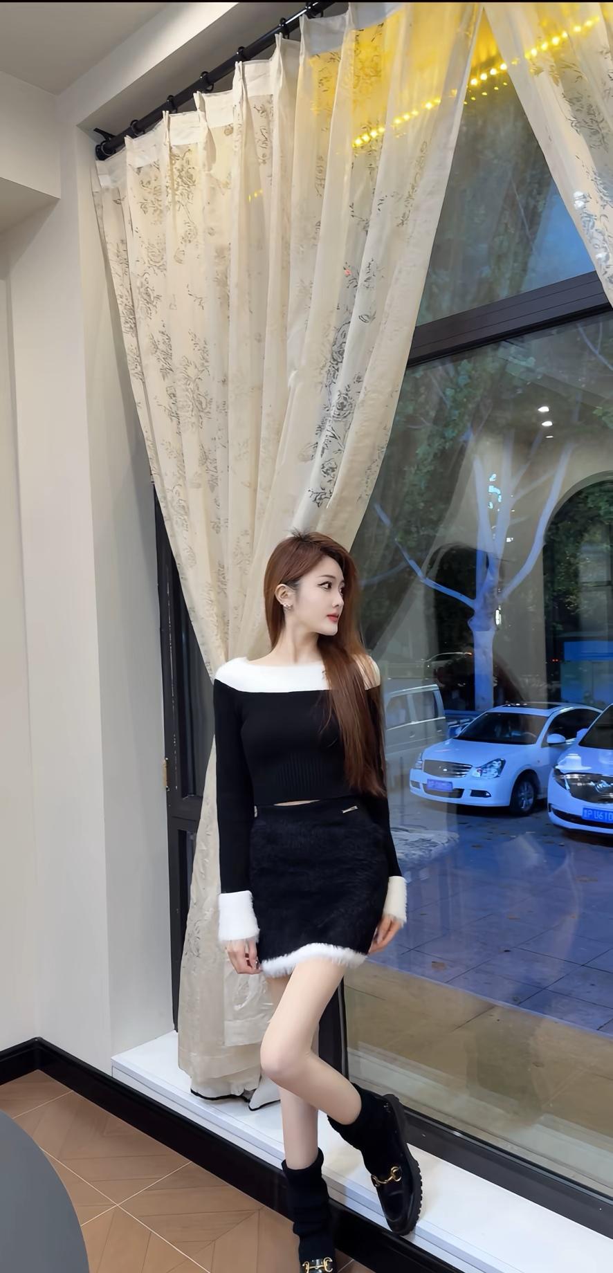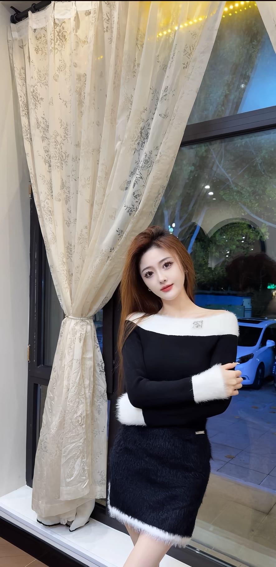 优雅黑白色调,复古花卉背景,时尚黑白拼接毛衣,气质优雅,尽显女性魅力。