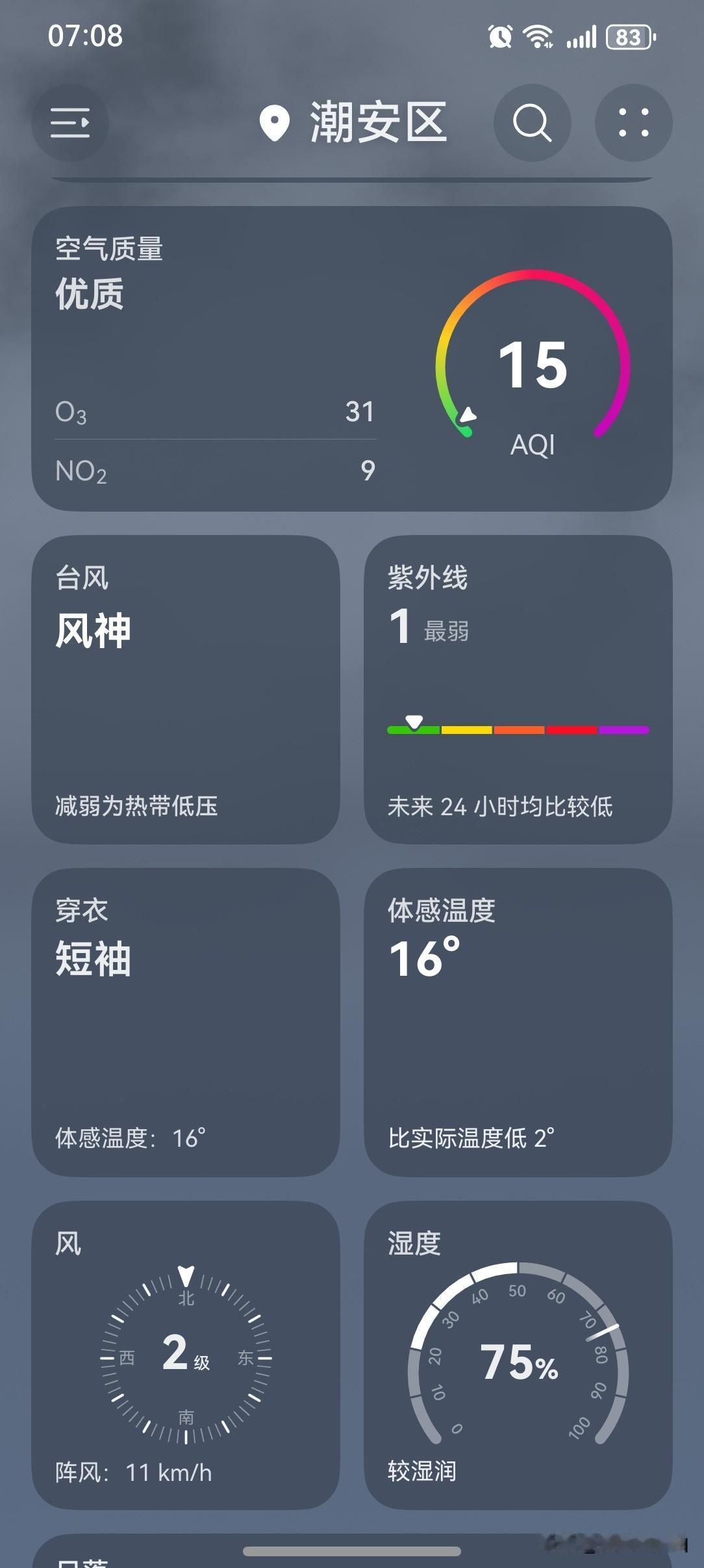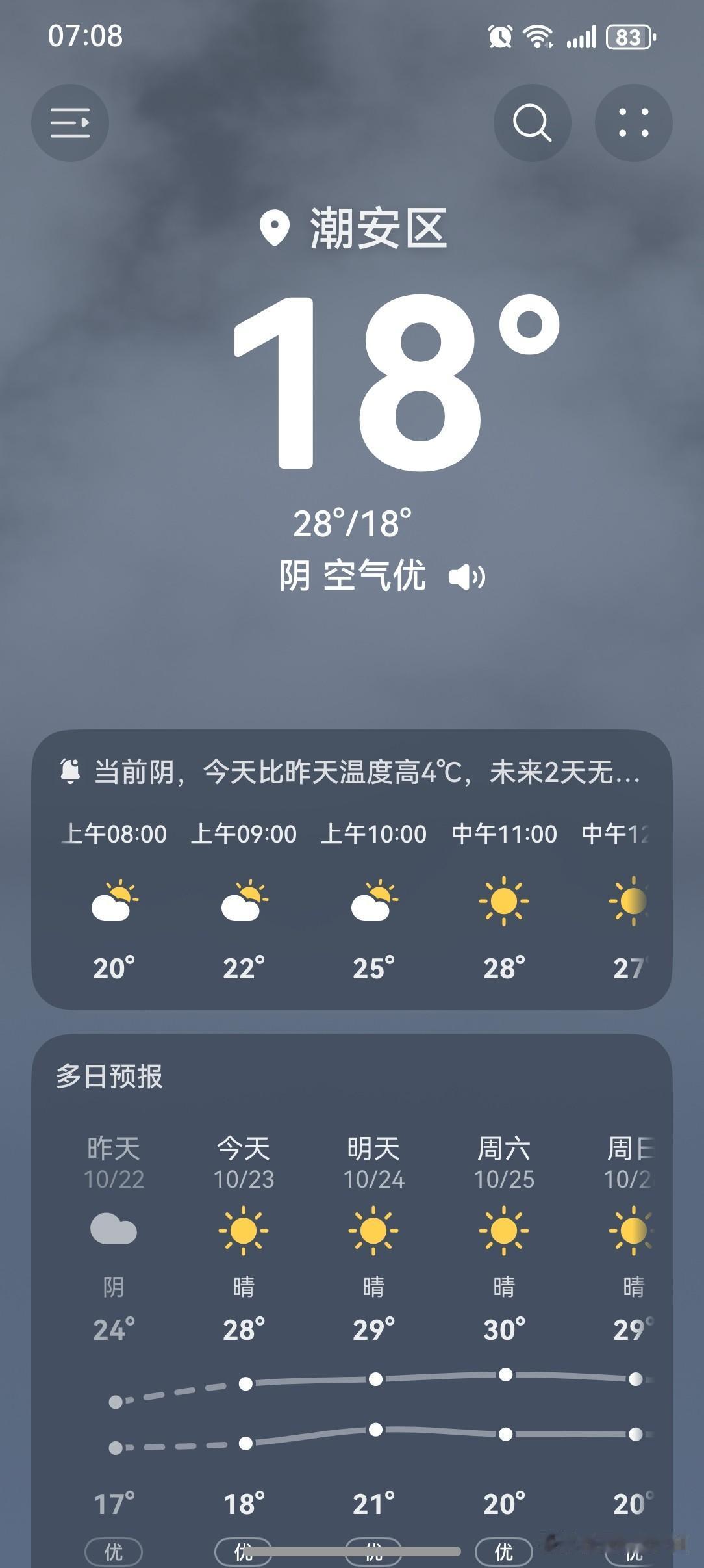 今日霜降, 受冷空气影响, 多地气温极速下降, 北方一夜入冬, 南方一夜入秋, 今年冬天是冷冬吗? 拭目以待吧! 在台风外围气流叠加冷空气的共同影响下, 广东气温也是极速下降, 降温+大风+雨水, 简直不要太酸爽! 换季式降温让广东人猝不及防, 幸好只是冷两天, 接下来广东阳光逐步回归! 今天(23日), 广东云量总体较多, 白天气温略有回升, 但体感不明显; 24~25日, 云量减少,阳光增多, 我省气温明显回升, 但昼夜温差大, 小伙伴们需要注意添衣保暖。 今天(23日), 潮州喜提一个多云天气, 气温18~28℃, 此刻气温18℃, 体感温度16℃。 可能是因为昨天被冷到了, 今天的气温明明比昨天高了2℃, 却觉得更冷了! 特别是走出门口时, 突然而来的一阵大风, 刮得人都想跑回屋里了, 好冷啊! 看看今天的天空, 云量有点多, 气温倒也还行, 会慢慢上升的。 今天的天气, 应该给个五星好评吧! 如此天气! 元芳,你怎么看?