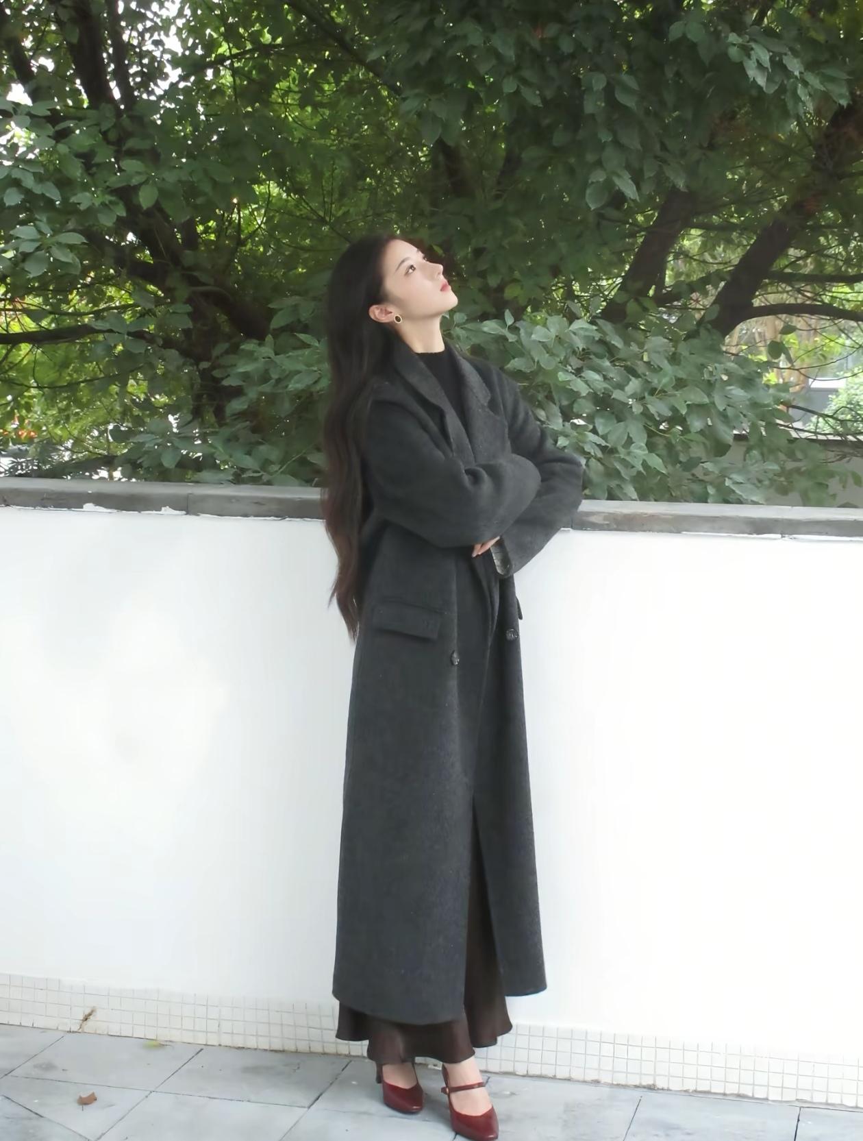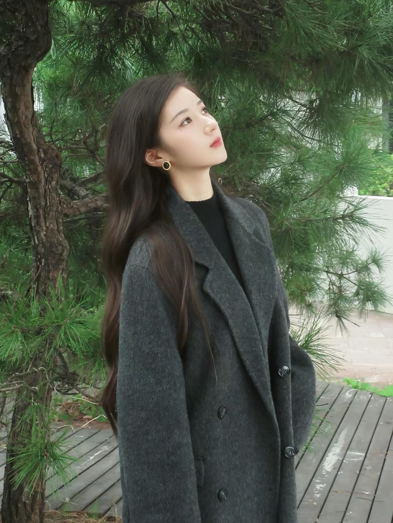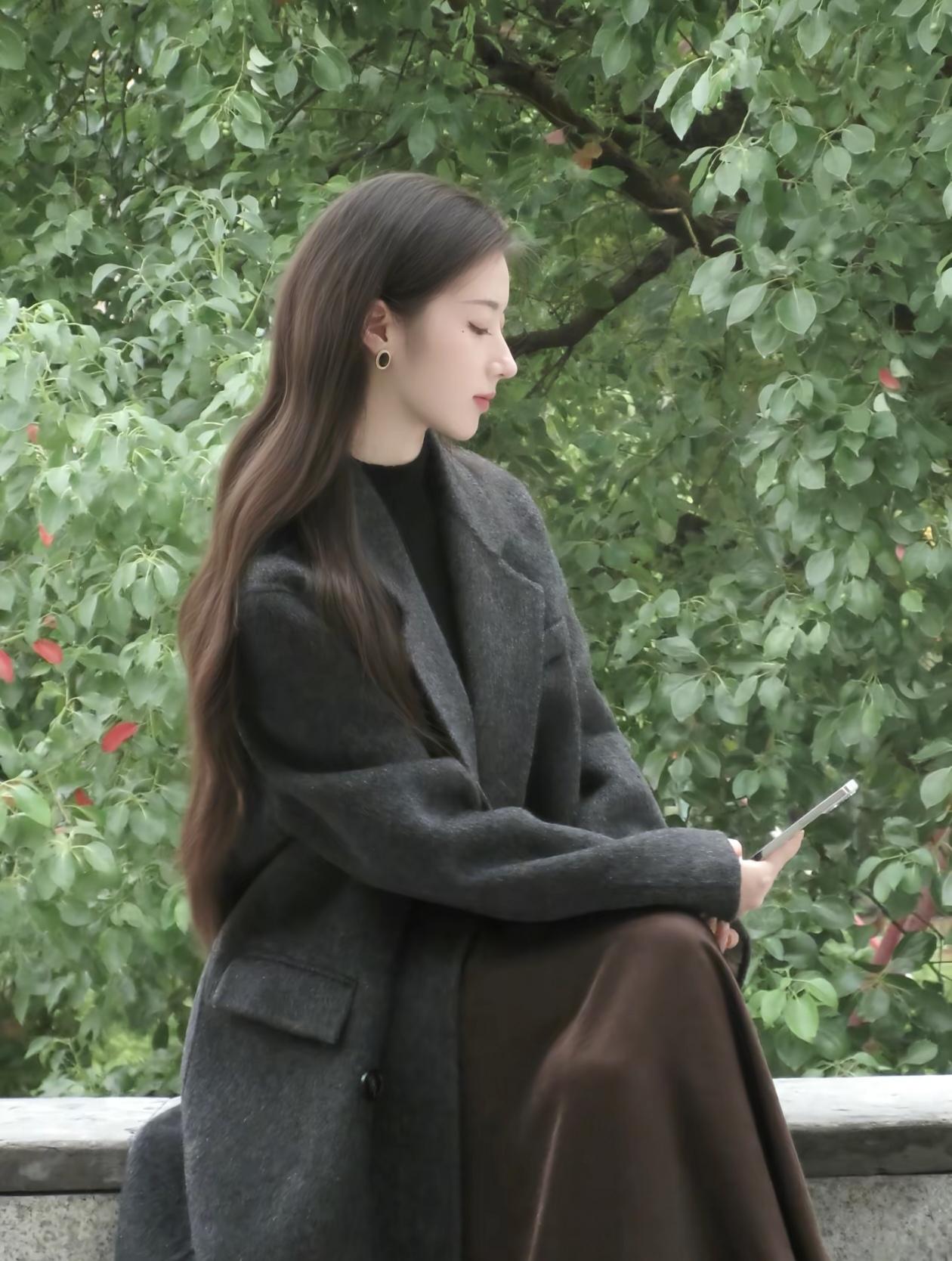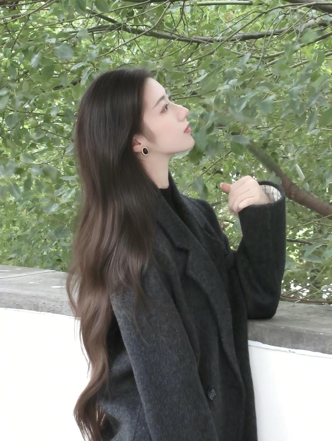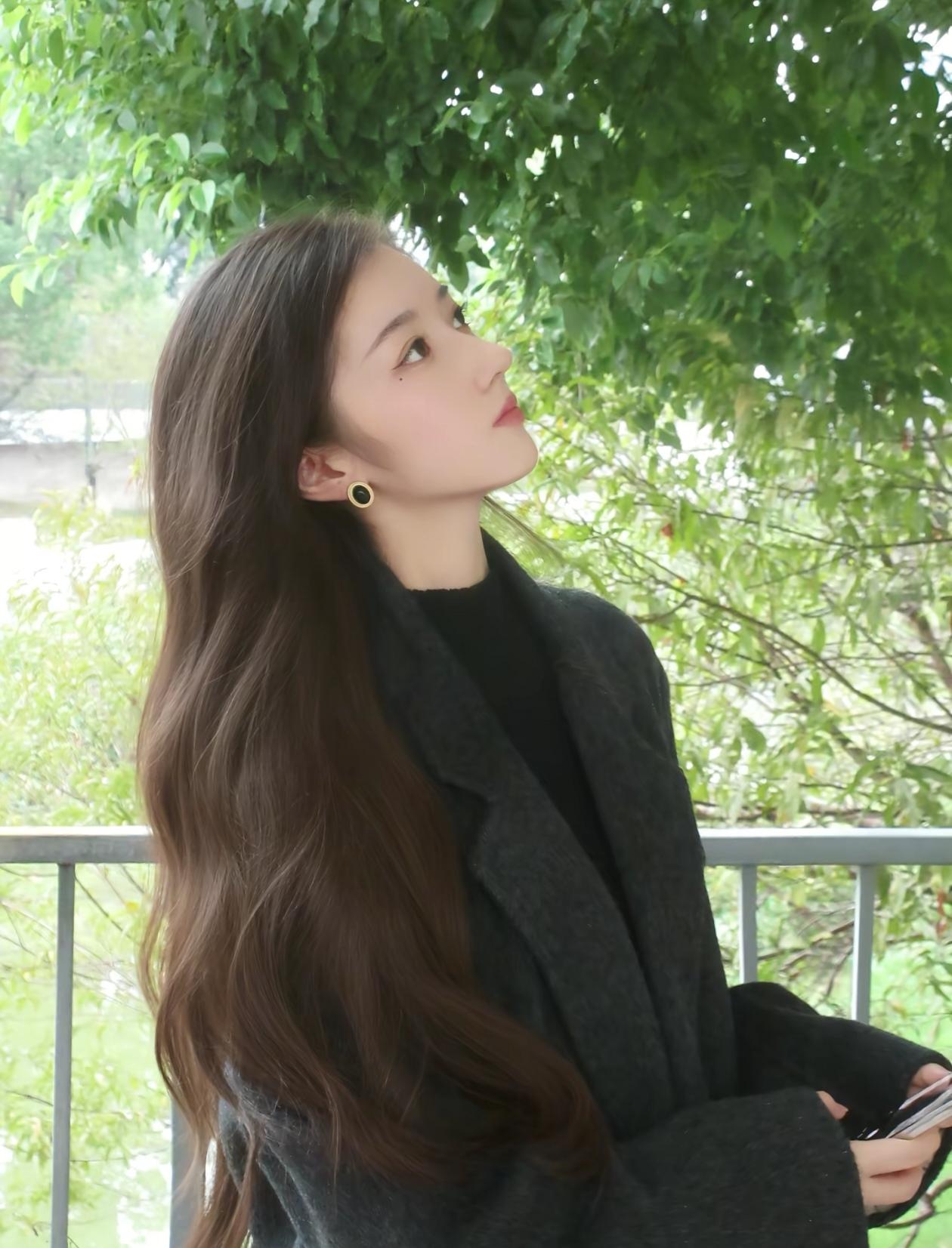 优雅黑衣少女,静谧绿意中,温柔微笑