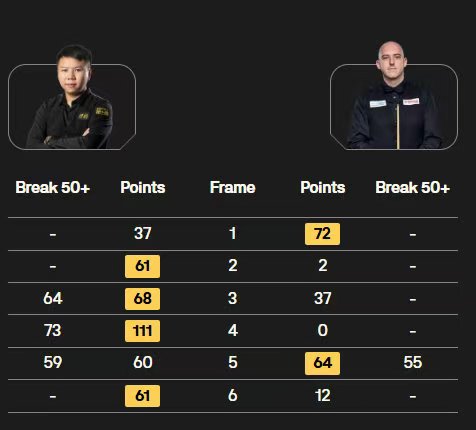 全场比赛周跃龙打出单杆64、73、59分,最终以4-2的比分战胜格雷斯,晋级16强。他将在下一轮迎战阿里-卡特。
