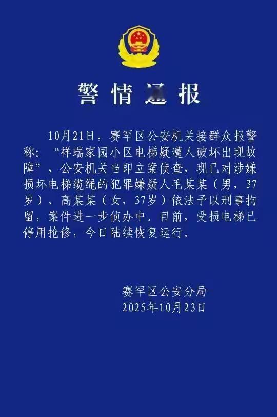 细思极恐!这两人主观恶意极大!恶意破坏电梯钢缆,而且多达23部,多亏及时发现,否则后果不堪设想。近日,内蒙古呼和浩特市赛罕区呼伦贝尔南路祥瑞家园小区发生一起严重电梯人为破坏事件。小区内50部电梯中,有23部电梯的钢绳被人恶意切割,庆幸的是电梯检修人员在日常巡检中及时发现隐患。据悉,被破坏的23部电梯损坏部位都集中在关键承重钢绳,一旦电梯投入运行,极有可能引发轿厢坠落等重大安全事故。接警后,警方第一时间介入调查。今天(10月23日),呼和浩特赛罕区警方通报称,“小区电梯疑遭人破坏出现故障”:2名犯罪嫌疑人已被刑拘。热点 呼和浩特一小区发生电梯人为破坏事件 警方通报呼市电梯遭破坏事件2名嫌疑人已被刑拘