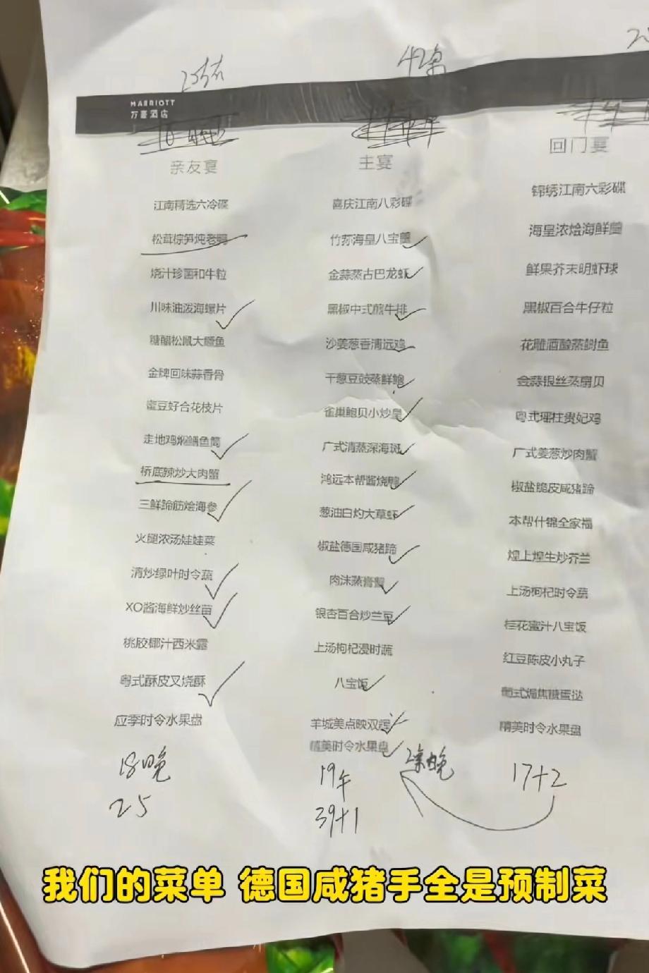 比西贝还黑的酒店出现了! 一名博主结婚,选择了上海某一家酒店,这场婚礼花了近40万,8888 元一桌,结果宾主吐槽菜品难吃,白切鸡还没熟,底下都是血汤儿。 后来博主潜入后厨一看,好家伙!德国咸猪手、八宝饭全是预制菜,新鲜虾变成冷冻虾,海鲜贝壳空有壳没肉……关键是,厨房还一片狼藉,脏的很,一点都不像大酒店! 酒店之前明明承诺 "100% 没有预制菜",现在却发律师函说博主 "发布不实言论",要求删帖道歉。客服说无法回应,宴会部只说在调查,连菜单都不敢亮出来。 现在全国都在查宴席餐饮,尤其是自从西贝预制菜事件发生之后,大家对吃的越来越较真。 办婚礼最看重脸面,宾客吃不好,主人家多尴尬!预订时一定要把 "是否用预制菜" 写进合同,有问题及时保留证据,别花了钱还受气! 上海办酒席 上海婚宴餐厅
