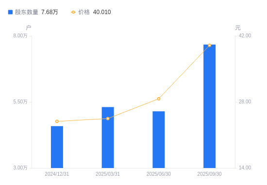 日期A股户数(户)流通A股户均持股数(股)户均持股市值(万元)2025-09-307675835172.18140.722025-06-305147952443.64150.412025-03-315304950891.55124.582024-12-314584858884.71140.682024-09-305573348440.71106.762024-06-305233151589.80123.302024-03-315328050670.91118.162023-12-314652958022.8793.712023-09-305147052452.8178.052023-06-306576241053.2854.07