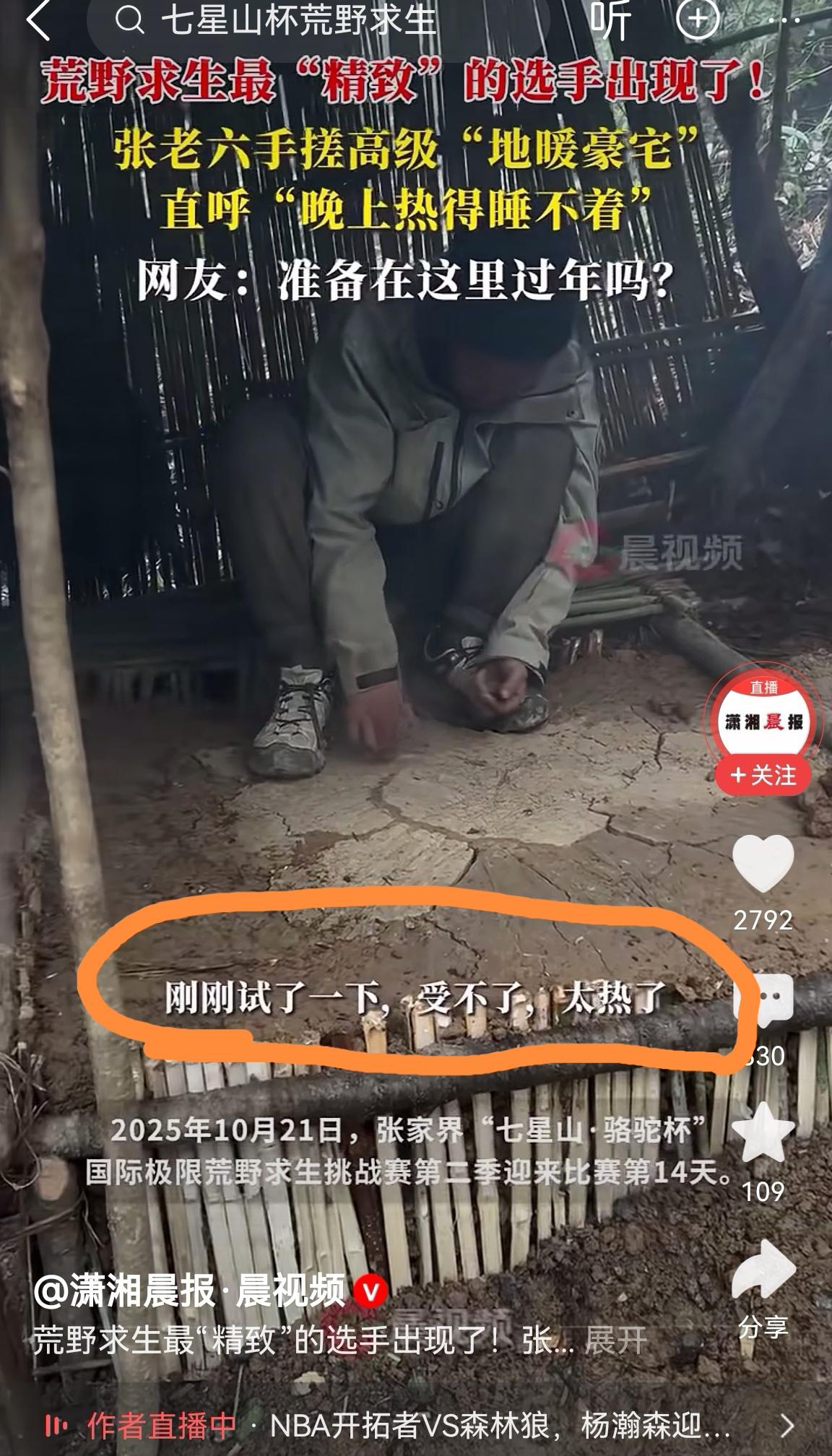 要被荒野求生的大神笑坏了, 这哥们用事实证明南方人分不清火炕与铁板烧。[笑哭] 就这大神还抱怨“受不了,太热了,晚上睡不着”。 看到土板下那熊熊燃烧的火焰🔥,北方人表示惊呆了。 直接睡在火的上方,只隔着一层土板,这要是能睡着,那就成仙了。 坐在火上面烤,神话里叫炼丹。 引一条气道,用热浪保暖才叫火炕。