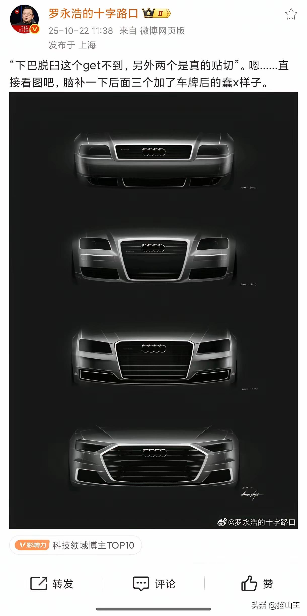 罗永浩这是没完了吗? 之前是抓着西贝不放, 现在是想碰瓷汽车圈吗? 别的不说,就奥迪那个大嘴,那可不是设计师的锅啊,当年奥迪这个设计,特别是a6在中国大火大热,中国人就是喜欢。从官员到普通人就是特别喜欢,然后家族化设计风靡全球,就这么自然而然的延续起来了。人家公司一看嘴越大,卖的越好,那你是设计师或者是你是老板,你是不是也会加大啊? 另外,BBA这三家可都是大企业,不可能惯着你罗永浩,好自为之吧!