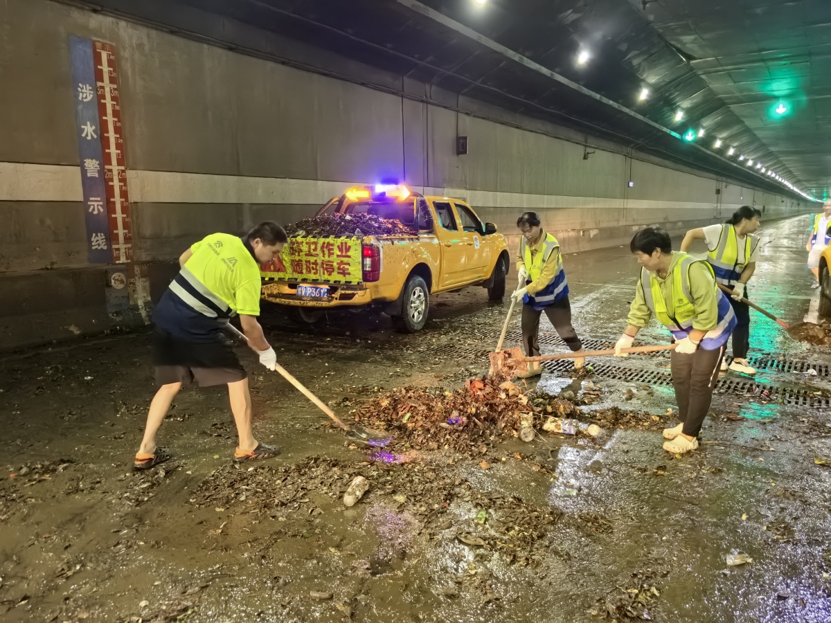 当时已是晚高峰时段,在路段外围,他们把环卫车辆车灯打开,照亮积水区域警示过往车辆避险,在积水超过安全线后及时设置警示标识引导绕行。