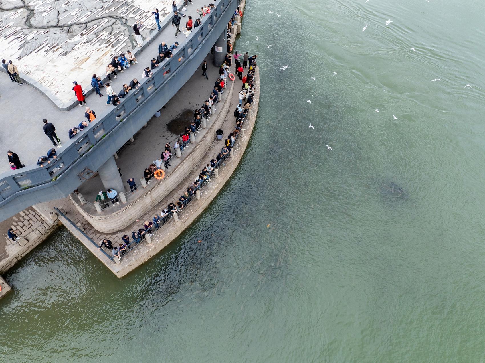 你去宜宾三江口看鱼了吗?记者日前在四川省宜宾市翠屏区合江门广场看到,金沙江、岷江、长江交汇处的三江口,聚集了大量市民、游客,不乏摄影爱好者,大家的目光聚焦在水中翻腾的野生鱼上。