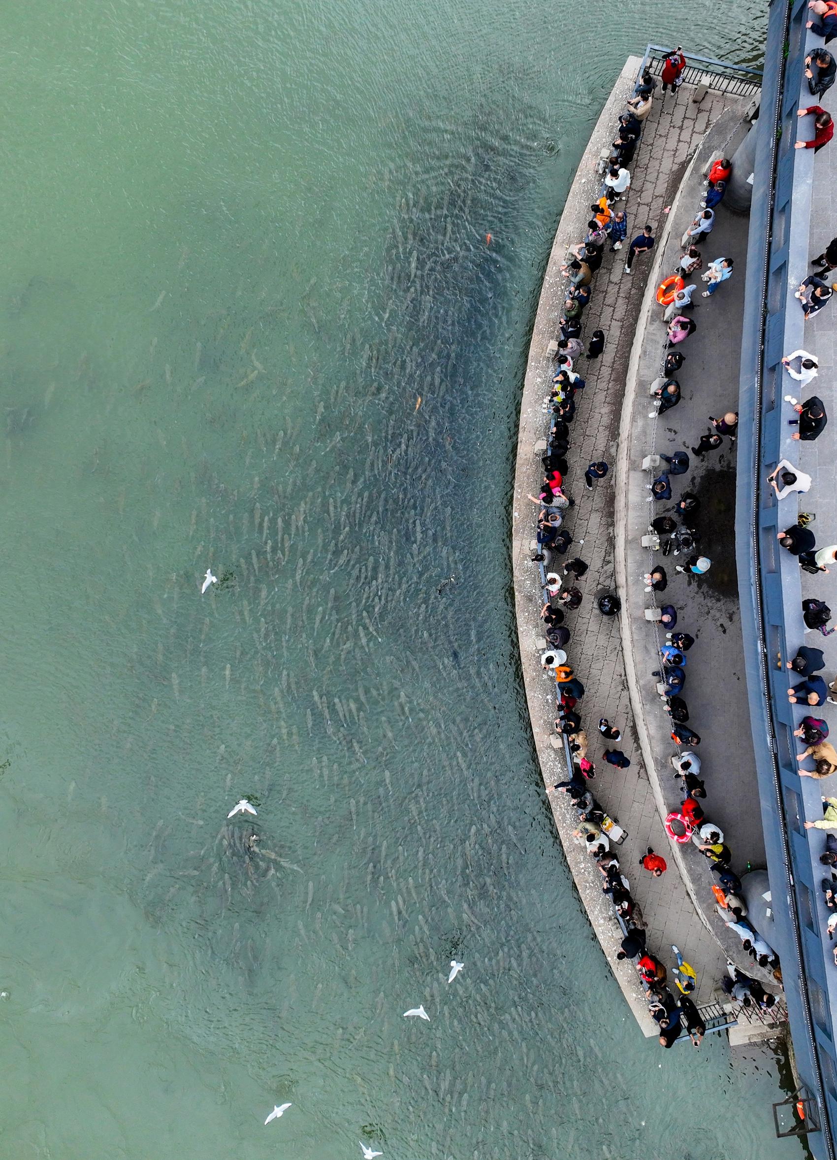 记者在宜宾合江门广场、长江公园等地看到,不少市民带着馒头等食物向江中抛撒,引来鱼群翻涌争夺。四川省自然保护地工作总站相关负责人提醒,人与野生鱼类之间是“距离产生美”。“宜宾三江口位于四川省长江上游珍稀特有鱼类国家级自然保护区内,随意抛撒会影响鱼群健康、生态平衡。”