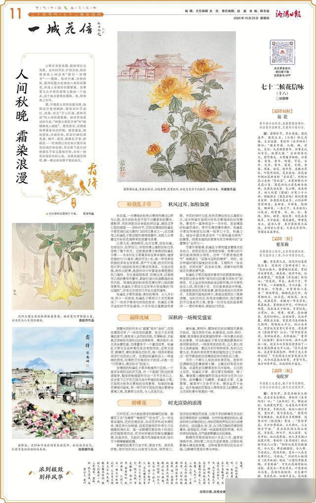 按:霜绛时节,草木黄落,菊花盛开。菊花之名,《尔雅》称之为蘜,又名治蔷。李时珍《本草纲目》释曰:“菊本作蘜。从鞠。鞠,穷也。月令:九月鞠有黄华。华事至此而穷尽,故谓之蘜。”后世则简化之,皆作菊也。又有诸多雅称,曰寿客、金英、黄华、陶菊、节花、女华、九华、黄华、霜英、日精、寿客、周盈、金蕊、禽华等。其株为草本,叶裂作羽状,花生枝端。其花朵外侧如花瓣者称“舌状花”,内侧如花心者称“管状花”,亦有瓣繁而不见花心者。菊花初仅以其色略分数种,或黄或白或紫。宋以降,品类渐多,时人刘蒙《菊谱》计有三十六种,明杨循吉《菊花百咏》则记有菊名百种。今菊花形色益多,以形分即有管瓣类、直瓣类、平瓣类、匙瓣类,畴瓣类,一类之下,又具数形;以色分,则有黄、白、粉、红、青绿、墨红、暗紫、鲑红等。形色品类极多,不可胜数。菊花诸色,唯黄色为正,最为人赏。其不畏秋寒之品性,亦得世人赞美,尤其九月重阳,赏菊遂成盛事也。
