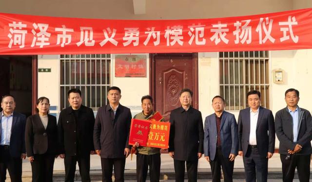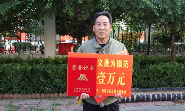 10月22日,菏泽市见义勇为模范表扬仪式在郓城县陈坡乡杨寺村举行,仪式上,为深河中托救4人的杨学瑞颁发了“菏泽市见义勇为模范”证书和10000元奖金。
