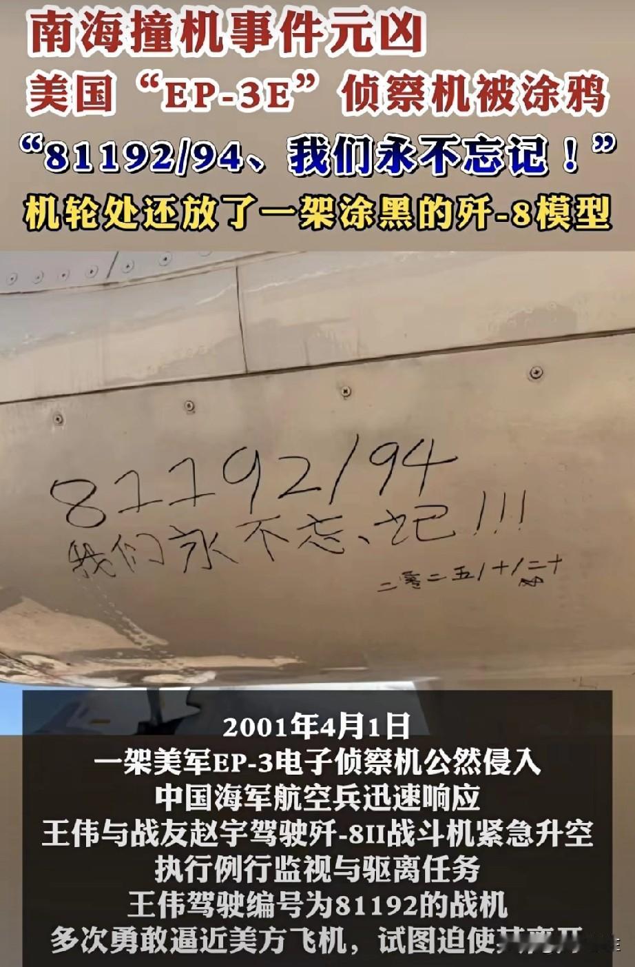“我们永不忘记!!!” 美国博物馆EP-3E被涂鸦! 美国当地时间10月20日,有人在位于亚利桑那州的皮马航空航天博物馆给当年南海撞机的元凶“EP-3E”侦察机上涂鸦“81192/94”、“我们永不忘记”还放了一架涂黑的歼-8II模型。 老美气死了?全球通缉谁干🉐?可以肯定的是一名中国人干的。但是谁干的不知道。老美的警察到处在抓人,但是不知道抓谁。 老美干的缺德事,天天宣传自己的功绩在博物馆展览,这次终于踢到铁板了。“我们永不忘记!!!”这几个字时刻在警醒我们,血债血偿!